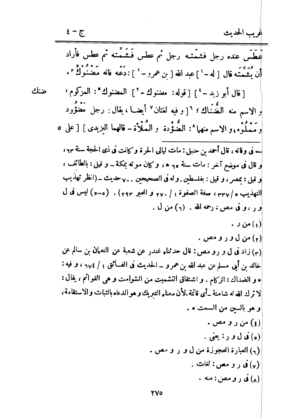 عَطَسَ عِنْده رجل فشمّته رجل ثمَّ عطس فَشَمَّته ثمَّ عطس فَأَرَادَ أَن يُشَمِّتَه قَالَ [لَهُ -] عبد الله [بن عَمْرو -] : دَعْه فَإِنَّهُ مَضْنُوْكٌ. [قَالَ أَبُو زيد -] [قَوْله: مضنوك -] المضنوك: المزكوم وَالِاسْم مِنْهُ الضُّنَاك [وَفِيه لُغَتَانِ أَيْضا يُقَال: رجل مَضْؤُود ومَمْلُوء وَالِاسْم مِنْهُمَا: الضُّؤْدة والمُلاْة قالهما اليزيدي] [على