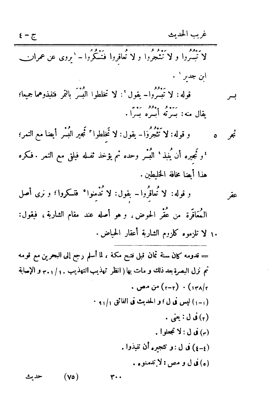 لَا تَبْسُرُوا وَلَا تَثْجُرُوا وَلَا تُعاقِروا فَتْسُكُروا يرْوى عَن عمرَان ابْن جدير. قَوْله: لَا تَبْسُرُوا يَقُول: لَا تخلطوا البُسْرَ بِالتَّمْرِ فتنبذوهما جَمِيعًا يُقَال مِنْهُ: بَسَرْتُه أبْسُرُه بَسْراً. وَقَوله: لَا تَثْجُرُوا يَقُول: لَا تَخلِطوا ثَجير البُسْر أَيْضا مَعَ التَّمْر وثَجِيره أَن يُنبذ البُسْر وَحده ثمَّ يُؤْخَذ ثفله فَيلقى مَعَ التَّمْر. فكره هَذَا أَيْضا مَخَافَة الخليطين. وَقَوله: لَا تُعاقِرُوا يَقُول: لَا تُدْمِنوا فتسكروا ونرى أصل المُعَاقَرة من عُقْر الْحَوْض وَهُوَ أَصله عِنْد مقَام الشاربة فَيَقُول: لَا تلزموه كلزوم الشاربة أعقار الْحِيَاض.