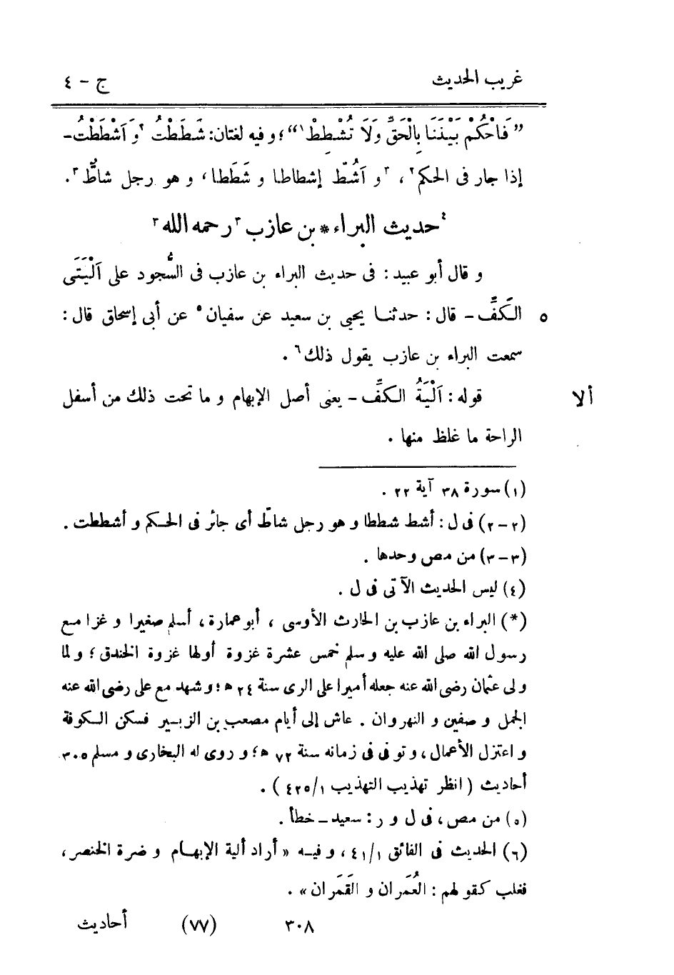 أَلا أم وَقَالَ أَبُو عبيد: فِي حَدِيث الْبَراء بن عَازِب فِي السُّجود على أَلْيَتَي الكَفِّ قَالَ: حَدثنَا يحيى بن سعيد عَن سُفْيَان عَن أبي إِسْحَاق قَالَ: سَمِعت الْبَراء بن عَازِب يَقُول ذَلِك. قَوْله: أَلْيَةُ الكفِّ يَعْنِي أصل الْإِبْهَام وَمَا تَحت ذَلِك من أَسْفَل الرَّاحَة مَا غلظ مِنْهَا.
