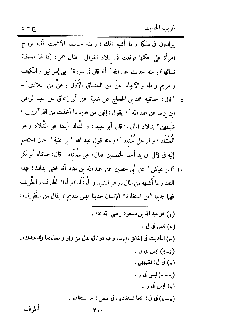 يولدون فِي ملكه وَمَا أشبه ذَلِك وَمِنْه حَدِيث الْأَشْعَث أَنه تزوج امْرَأَة على حكمهَا فَوَقَعت فِي تِلاد الغوالي فَقَالَ عمر: إِنَّمَا لَهَا صَدَقَة نسائها وَمِنْه حَدِيث عبد الله أَنه قَالَ فِي سُورَة بني إِسْرَائِيل والكهف وَمَرْيَم وطه والأنبياء: هنَّ من الْعتاق الأُوَل وهنَّ من تلادي قَالَ: حَدَّثَنِيهِ مُحَمَّد بن الْحجَّاج عَن شُعْبَة عَن أبي إِسْحَاق عَن عبد الرَّحْمَن ابْن يزِيد عَن عبد الله يَقُول: إنَّهُنَّ من قديم مَا أخذت من الْقُرْآن شبَّههن بتلاد المَال. قَالَ أَبُو عبيد: والتَّالد أَيْضا هُوَ التِّلاد وَهُوَ المُتْلَد وَالرجل مُتْلِد وَمِنْه قَول عبد الله بن عتبَة حِين اخْتصم إِلَيْهِ فِي لآلي فِي يَد أحد الْخَصْمَيْنِ فَقَالَ: هِيَ للمُتْلدِ قَالَ: حدّثنَاهُ أَبُو بكر ابْن عَيَّاش عَن أبي حُصَيْن عَن عبد الله بن عتبَة أَنه قضى بذلك فَهَذَا التالد وَمَا أشبهه من المَال وَهُوَ التَّليد والمُتْلَد وَأما الطَّارف والطَّريف فهما جَمِيعًا من استفادة الْإِنْسَان حَدِيثا لَيْسَ بقديم يُقَال من الطريف: