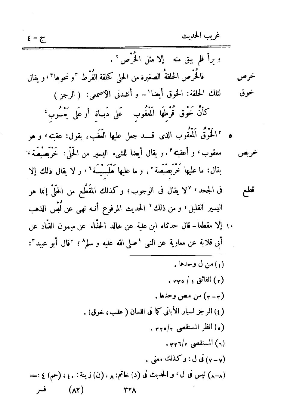 الخَوْقُ اَلمعْقُوب الَّذِي قد جعل عَلَيْهَا العَقَب يَقُول: عقبته وَهُوَ معقوب وأعقبته. وَيُقَال أَيْضا للشَّيْء الْيَسِير من الحَلْي: خَرْبَصْيَصة يُقَال: مَا عَلَيْهَا خَرْبَصِيْصَة وَمَا عَلَيْهَا هَلْبَسِيْسَة وَلَا يُقَال ذَلِك إِلَّا فِي الْجحْد لَا يُقَال فِي الْوُجُوب وَكَذَلِكَ المقَطَّع من الحَلْي إِنَّمَا هُوَ الْيَسِير الْقَلِيل وَمن ذَلِك الحَدِيث الْمَرْفُوع أَنه نهى عَن لُبْس الذَّهَب إِلَّا مقطعا قَالَ حدّثنَاهُ ابْن علية عَن خَالِد الحذّاء عَن مَيْمُون القنّاد عَن أبي قلَابَة عَن مُعَاوِيَة عَن النَّبِيّ صلي الله عَلَيْهِ وَسلم قَالَ أَبُو عبيد: