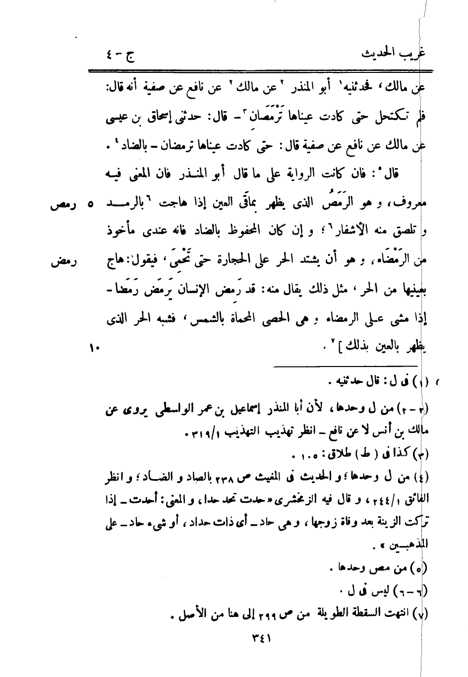عَن مَالك فَحَدَّثَنِيهِ أَبُو الْمُنْذر عَن مَالك عَن نَافِع عَن صَفِيَّة أَنه قَالَ: فَلم تكتحل حَتَّى كَادَت عَيناهَا تَرْمَصَانِ - قَالَ: حَدثنِي إِسْحَاق بن عِيسَى عَن مَالك عَن نَافِع عَن صَفِيَّة قَالَ: حَتَّى كَادَت عَيناهَا ترمضان بالضاد. قَالَ: فَإِن كَانَت الرِّوَايَة على مَا قَالَ أَبُو الْمُنْذر فَإِن الْمَعْنى فِيهِ مَعْرُوف وَهُوَ الرَمَصُ الَّذِي يظْهر بمأَقَي الْعين إِذا هَاجَتْ بالرمد وتلصق مِنْهُ الأشفار وَإِن كَانَ الْمَحْفُوظ بالضاد فَإِنَّهُ عِنْدِي مَأْخُوذ من الرَمْضَاء وَهُوَ أَن يشْتَد الْحر على الْحِجَارَة حَتَّى تَحْمِيَ فَيَقُول: هاج بعينيها من الْحر مثل ذَلِك يُقَال مِنْهُ: قد رَمِض الْإِنْسَان يَرمَض رَمَضا إِذا مَشى على الرمضاء وَهِي الْحَصَى المحماة بالشمس فَشبه الْحر الَّذِي يظْهر بِالْعينِ بذلك] .