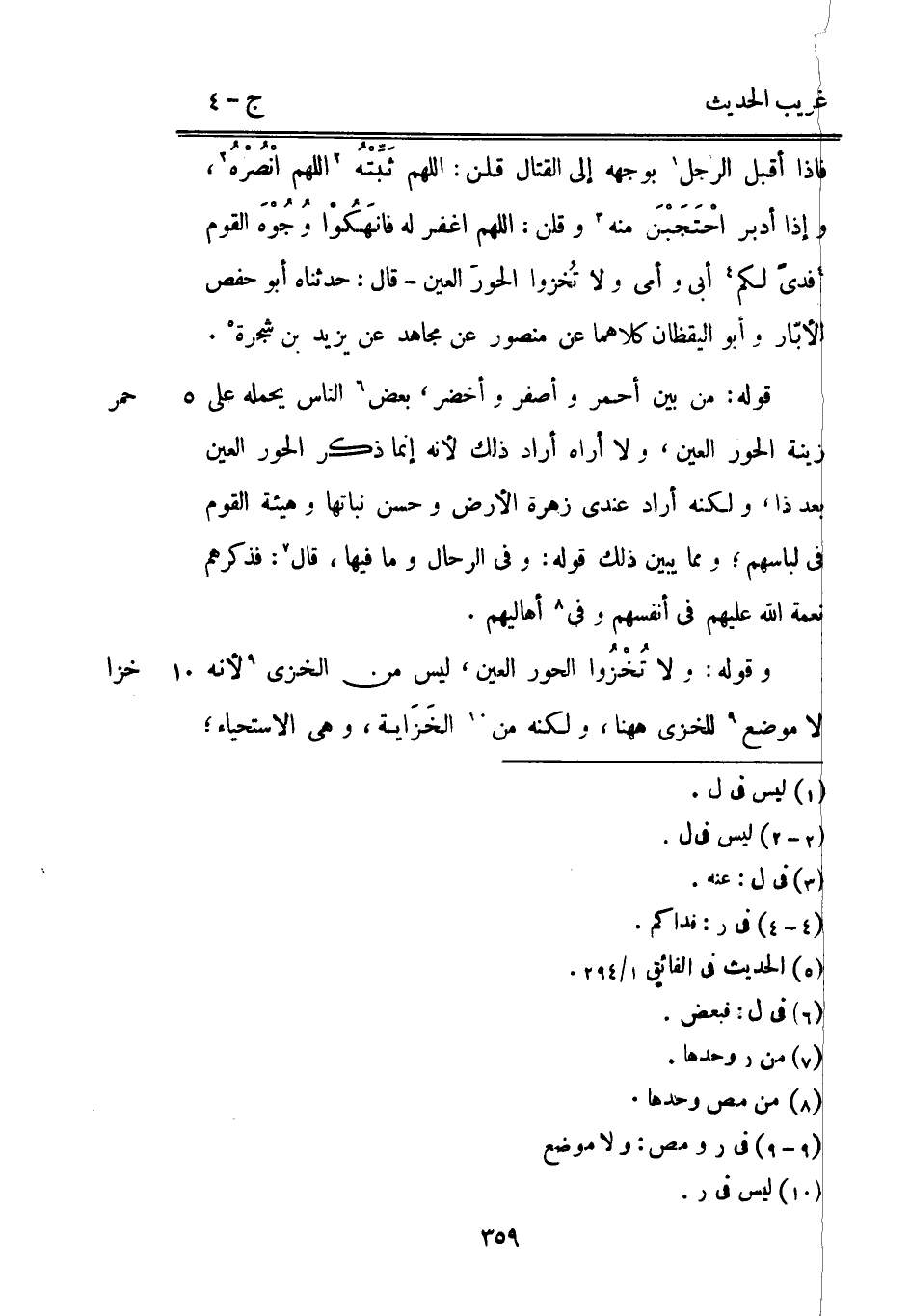 فَإِذا أقبل الرجل بِوَجْهِهِ إِلَى الْقِتَال قُلْنَ: اللَّهُمَّ ثَبِّتْهُ اللَّهُمَّ اْنصُرْهُ وَإِذا أدبر احْتَجَبْنَ مِنْهُ وقلن: اللَّهُمَّ اغْفِر لَهُ فأنهَكُوْا وُجُوْهَ الْقَوْم فدى لكم أبي وَأمي وَلَا تُخزوا الحورَ الْعين قَالَ: حدّثنَاهُ أَبُو حَفْص الأبّار وَأَبُو الْيَقظَان كِلَاهُمَا عَن مَنْصُور عَن مُجَاهِد عَن يزِيد بن شَجَرَة. قَوْله: من بَين أَحْمَر وأصفر وأخضر بعض النَّاس يحملهُ على زِينَة الْحور الْعين وَلَا أرَاهُ أَرَادَ ذَلِك لِأَنَّهُ إِنَّمَا ذكر الْحور الْعين بعد ذَا وَلكنه أَرَادَ عِنْدِي زهرَة الأَرْض وَحسن نباتها وهيئة الْقَوْم فِي لباسهم وَمِمَّا يبين ذَلِك قَوْله: وَفِي الرّحال وَمَا فِيهَا قَالَ: فَذكرهمْ نعْمَة الله عَلَيْهِم فِي أنفسهم وَفِي أَهَالِيهمْ. وَقَوله: وَلَا تُخْزُوا الْحور الْعين لَيْسَ من الخزي لِأَنَّهُ لَا مَوضِع للخزي هَهُنَا وَلكنه من الخَزَاية وَهِي الاستحياء