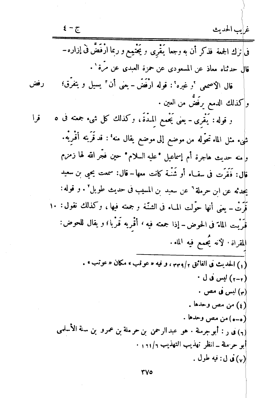 فِي ترك الْجُمُعَة فَذكر أَن بِهِ وجعا يَقْرِي ويَجْتمِع وَرُبمَا ارْفَضَّ فِي إزَاره قَالَ حدّثنَاهُ معَاذ عَن المَسْعُودِيّ عَن حَمْزَة الْعَبْدي عَن مرّة. قَالَ الْأَصْمَعِي وَغَيره: قَوْله ارْفَضّ يَعْنِي أَن يسيل ويتفرّق وَكَذَلِكَ الدمع يرفَضُّ من الْعين. وَقَوله: يَقْرِي يَعْنِي يَجْمع المِدّةَ وَكَذَلِكَ كل شَيْء جمعته فِي شَيْء مثل المَاء تحوّله من مَوضِع إِلَى مَوضِع يُقَال مِنْهُ: قد قَرَيته أقْرِيْه. وَمِنْه حَدِيث هاجرة أم إِسْمَاعِيل عَلَيْهِ السَّلَام حِين فجّر الله لَهَا زَمْزَم قَالَ: فَقَرَت فِي سقاء أَو شَنّة كَانَت مَعهَا - قَالَ: سَمِعت يحيى بن سعيد يحدثه عَن ابْن حَرْمَلَة عَن سعيد بن الْمسيب فِي حَدِيث طَوِيل. وَقَوله: قَرَتْ يَعْنِي أَنَّهَا حوّلت المَاء فِي الشنّة وَجمعته فِيهَا وَكَذَلِكَ نقُول: قَريْت الماءَ فِي الْحَوْض إِذا جمعته فِيهِ أقْرِيه قَرْيا وَيُقَال للحوض: المِقراة لِأَنَّهُ يجمع فِيهِ المَاء.