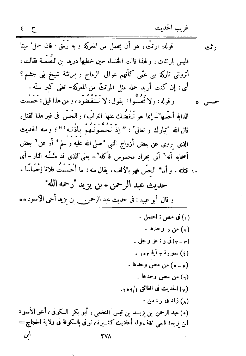 قَوْله: ارتثّ هُوَ أَن يحمل من المعركة وَبِه رَمَق فَإِن حمل مَيتا فَلَيْسَ بارتثاث وَلِهَذَا قَالَت الخنساء حِين خطبهَا دُرَيْد بن الصِّمّة فَقَالَت: أترونني تاركة بني عمي كَأَنَّهُمْ عوالي الرماح ومرتثة شيخ بني جُشم أَي: إِن كنت أُرِيد حمله مثل المرتثّ من المعركة تَعْنِي كبر سنّه. وَقَوله: وَلَا تَحُسُّوا يَقُول: لَا تَنْفُضُوْه وَمن هَذَا قيل: حَسَسْت الدَّابَّة أحسّها إِنَّمَا هُوَ نَفْضُك عَنْهَا الترابَ والحَسّ فِي غير هَذَا الْقَتْل قَالَ الله تبَارك وَتَعَالَى: {إذْ تَحُسُّوْنَهُمْ بأِذْنِه} وَمِنْه الحَدِيث الَّذِي يرْوى عَن بعض أَزوَاج النَّبِي صلى الله عَلَيْهِ وَسلم أَو عَن بعض أَصْحَابه أَنه أُتِي بجراد محسوس فَأَكله يَعْنِي الَّذِي قد مسَّتْه النَّار أَي قتلته. وَأما الحِسّ فَهُوَ بِالْألف يُقَال مِنْهُ: مَا أحْسَسْتُ فلَانا إحساسا.
