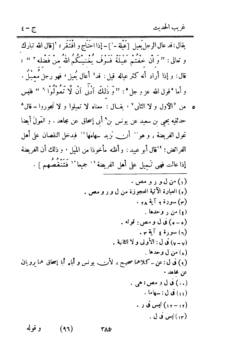 ربع بن قَالَ أَبُو عبيد: وَأَظنهُ مأخوذا من الْميل وَذَلِكَ أَن الْفَرِيضَة إِذا عالت فَهِيَ تَمِيل على أهل الْفَرِيضَة جَمِيعًا 13 فتنقصهم] .