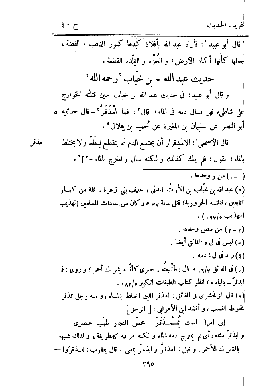 مذقر [رَحمَه وَقَالَ أَبُو عبيد: فِي حَدِيث عبد الله بن خباب حِين قتلتْه الْخَوَارِج على شاطئ نهر فَسَالَ دَمه فِي المَاء قَالَ: فَمَا امْذَقَرَّ قَالَ حَدَّثَنِيهِ أَبُو النَّضر عَن سُلَيْمَان بن الْمُغيرَة عَن حميد بْن هِلَال. قَالَ الْأَصْمَعِي: الامْذِقرار أَن يجْتَمع الدَّم ثمَّ يَنْقَطِع قِطَعًا وَلَا يخْتَلط بِالْمَاءِ يَقُول: فَلم يَك كَذَلِك وَلكنه سَالَ وامتزج بِالْمَاءِ -] .