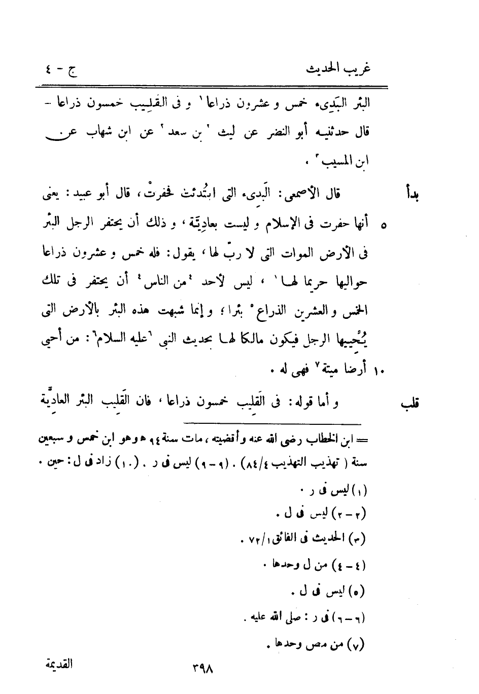 قلب قَالَ أَبُو عبيد: يَعْنِي أَنَّهَا حفرت فِي الْإِسْلَام وَلَيْسَت بعادِيَّة وَذَلِكَ أَن يحتفر الرجل الْبِئْر فِي الأَرْض الْموَات الَّتِي لَا ربّ لَهَا يَقُول: فَلهُ خمس وَعِشْرُونَ ذِرَاعا حواليها حريما لَهَا لَيْسَ لأحد من النَّاس أَن يحتفر فِي تِلْكَ الْخمس وَالْعِشْرين الذِّرَاع بِئْرا وَإِنَّمَا شبهت هَذِه الْبِئْر بِالْأَرْضِ الَّتِي يُحْيِيها الرجل فَيكون مَالِكًا لَهَا بِحَدِيث النَّبِي عَلَيْهِ السَّلَام: من أحيى أَرضًا ميتَة فَهِيَ لَهُ. وَأما قَوْله: فِي القَلِيب خَمْسُونَ ذِرَاعا فَإِن القليب الْبِئْر العادية