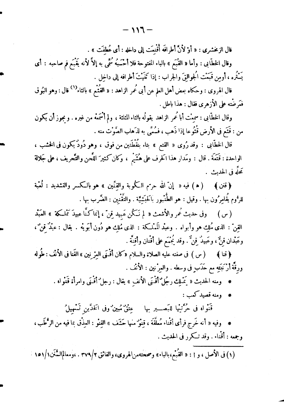 (1) في الأصل، وا: «القُبْع، بالباء» وصححته من الهروي، والفائق 2/ 379.، ومعالم السُّنَن 1/ 151
