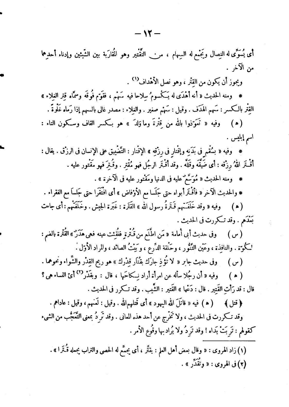 (1) زاد الهروي: «وقال بعض أهل العلم: يقتَّر، أى يجمّع له الحصى والتراب يجعله قُتَرا» .