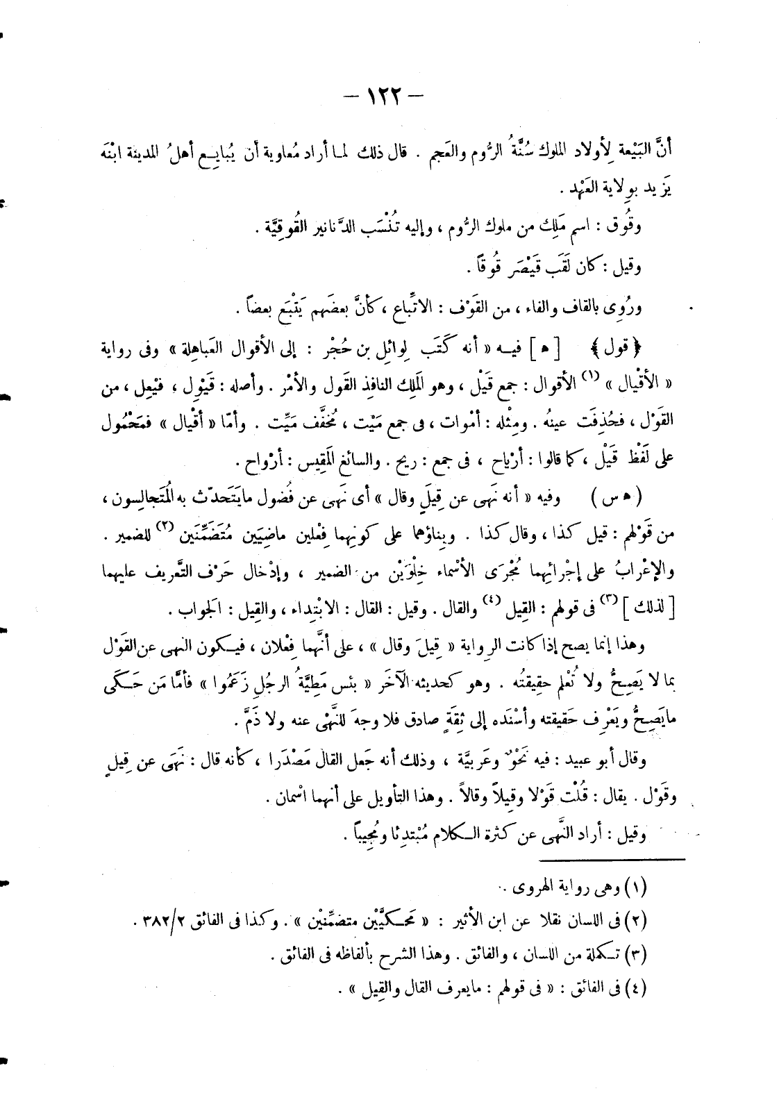 وَقَالَ أَبُو عُبَيْدٍ: فِيهِ نَحْوٌ وعَربيَّة، وَذَلِكَ أَنَّهُ جَعل الْقَالَ مَصْدراً، كَأَنَّهُ قَالَ: نَهَى عَنْ قِيلٍ وقَوْل. يُقَالُ: قُلْت قَوْلا وقِيلًا وَقَالًا. وَهَذَا التَّأْوِيلُ عَلَى أَنَّهُمَا اسْمان.