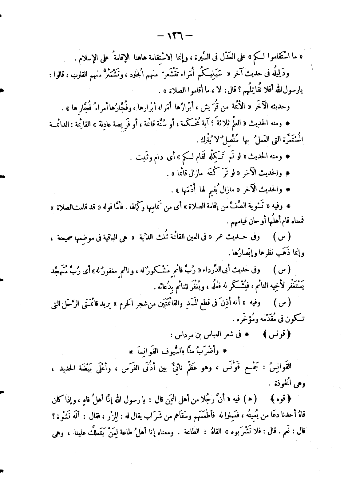 وَمِنْهُ الْحَدِيثُ «العلْم ثلاثةٌ؛ آيَةٌ مُحْكَمة، أَوْ سُنَّة قَائِمَةٌ، أَوْ فَريِضة عادِلة» القائِمة: الدَّائِمَةُ المُسْتَمِّرة الَّتِي العَملُ بِهَا مُتَّصِلٌ لَا يُتْرك.