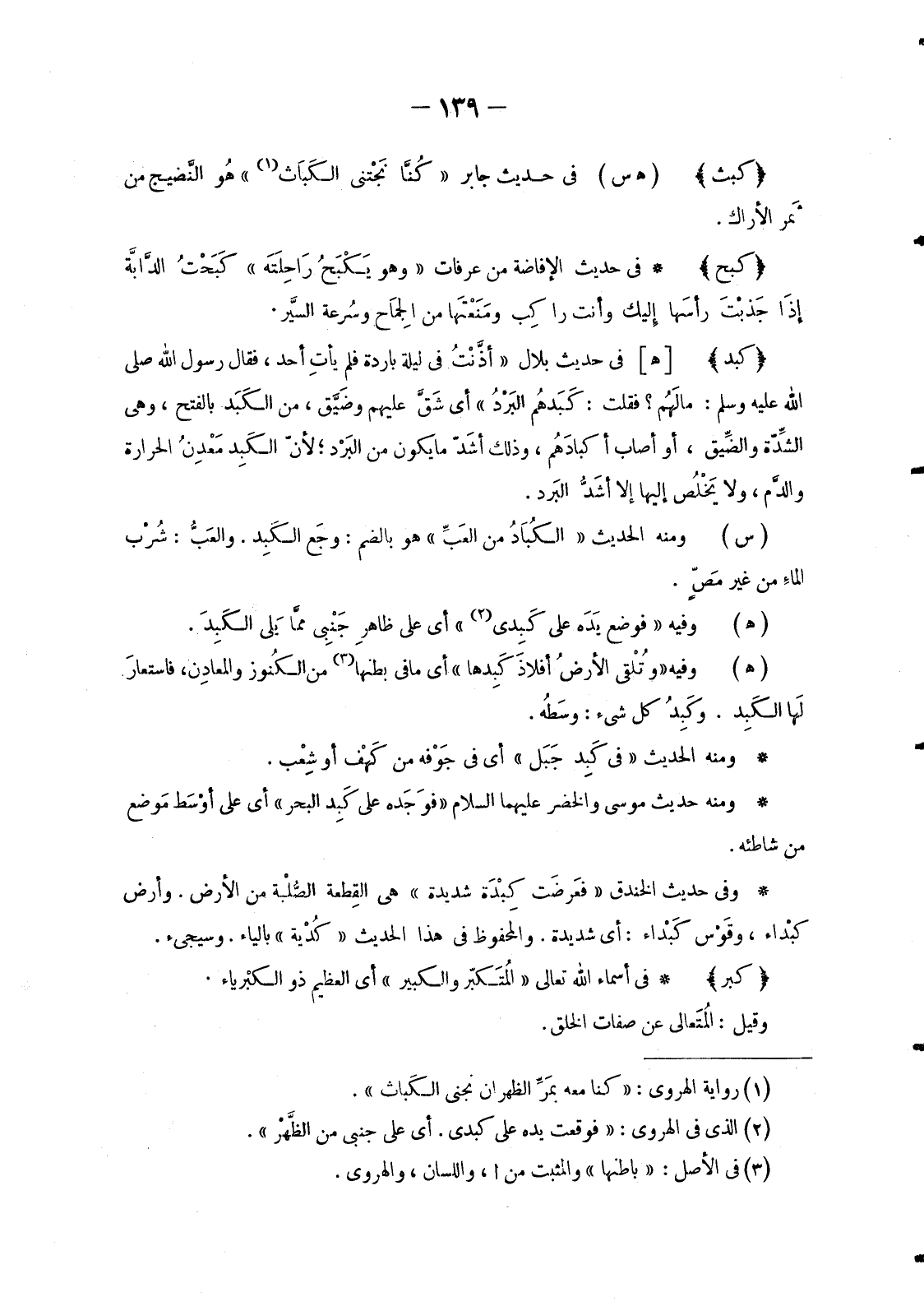 وَفِي حَدِيثِ الْخَنْدَقِ «فعَرضَت كِبْدَة شَدِيدَةٌ» هِيَ القِطعة الصُّلْبة مِنَ الْأَرْضِ. وَأَرْضٌ كَبْداء، وقَوْس كَبْداء: أَيْ شَدِيدَةٌ. وَالْمَحْفُوظُ فِي هَذَا الْحَدِيثِ «كُدْية» بِالْيَاءِ. وَسَيَجِيءُ.