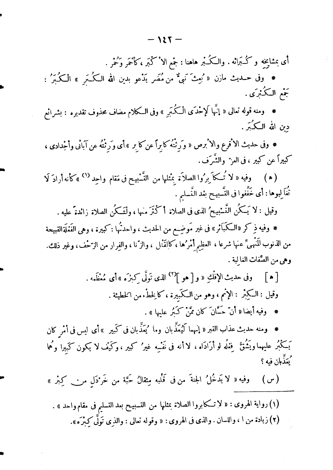 وَفِيهِ ذِكر «الكَبَائر» فِي غَيْرِ مَوضِع مِنَ الْحَدِيثِ، واحدتُها: كَبِيرَةٌ، وَهِيَ الفَعْلَة الْقَبِيحَةُ مِنَ الذُّنُوبِ المَنْهيِّ عَنْهَا شَرْعًا، العظِيمِ أمْرُها، كالقَتْل، وَالزِّنَا، والفِرار مِنَ الزّحْف، وَغَيْرِ ذَلِكَ.