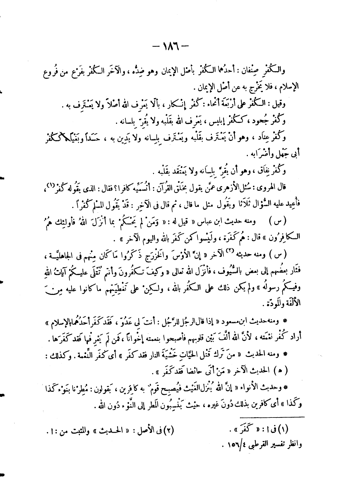 والكُفْر صِنْفان: أحدُهما الكُفْر بأصْل الْإِيمَانِ وَهُوَ ضِدُّه، والآخَر الكُفْر بفَرْع مِنْ فُروع الْإِسْلَامِ، فَلَا يَخْرج بِهِ عَنْ أصْل الْإِيمَانِ.