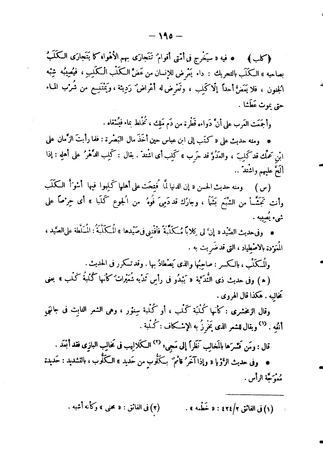 - فِيهِ «سيَخْرج فِي أُمَّتِي أقوامٌ تَتَجارى بِهِمُ الأهْوَاء كَمَا يَتجارى الكَلَبُ بصاحِبه» الكَلَب بِالتَّحْرِيكِ: دَاءٌ يَعْرِض لِلْإِنْسَانِ مِنْ عَضِّ الكَلْب الكَلِبِ، فيُصِيبُه شِبْه الجُنون، فَلَا يَعَضُّ أَحَدًا إِلَّا كَلِبَ، وتَعْرِض لَهُ أعْراضٌ رَدِيئة، ويَمْتَنِع مِنْ شُرْب الْمَاءِ حَتَّى يَمُوتَ عَطَشاً.