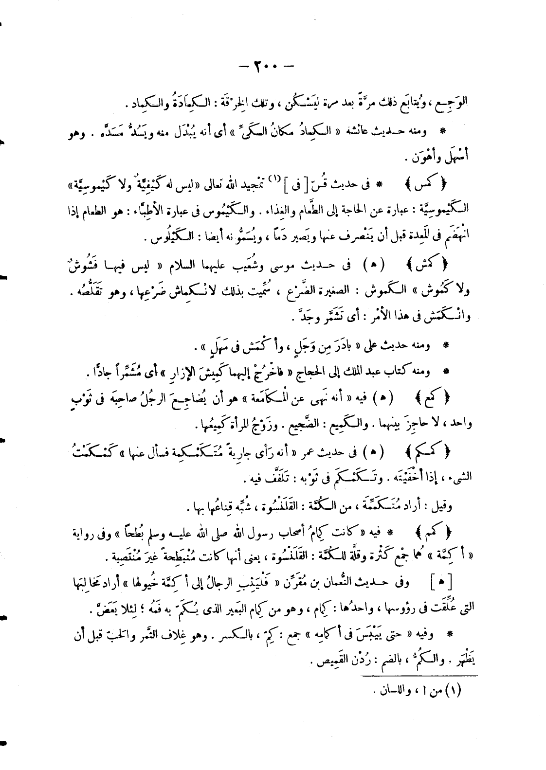 - فِيهِ «كَانَتْ كِمامُ أصحابُ رَسُولِ اللَّهِ صَلَّى اللَّهُ عَلَيْهِ وَسَلَّمَ بُطحاً» وَفِي رِوَايَةٍ «أَكِمَّة» هُما جمْع كَثْرة وقلَّة للكُمَّة: القَلَنْسُوة، يَعْنِي أَنَّهَا كَانَتْ مُنْبَطِحةً غيرَ مُنْتَصِبة.