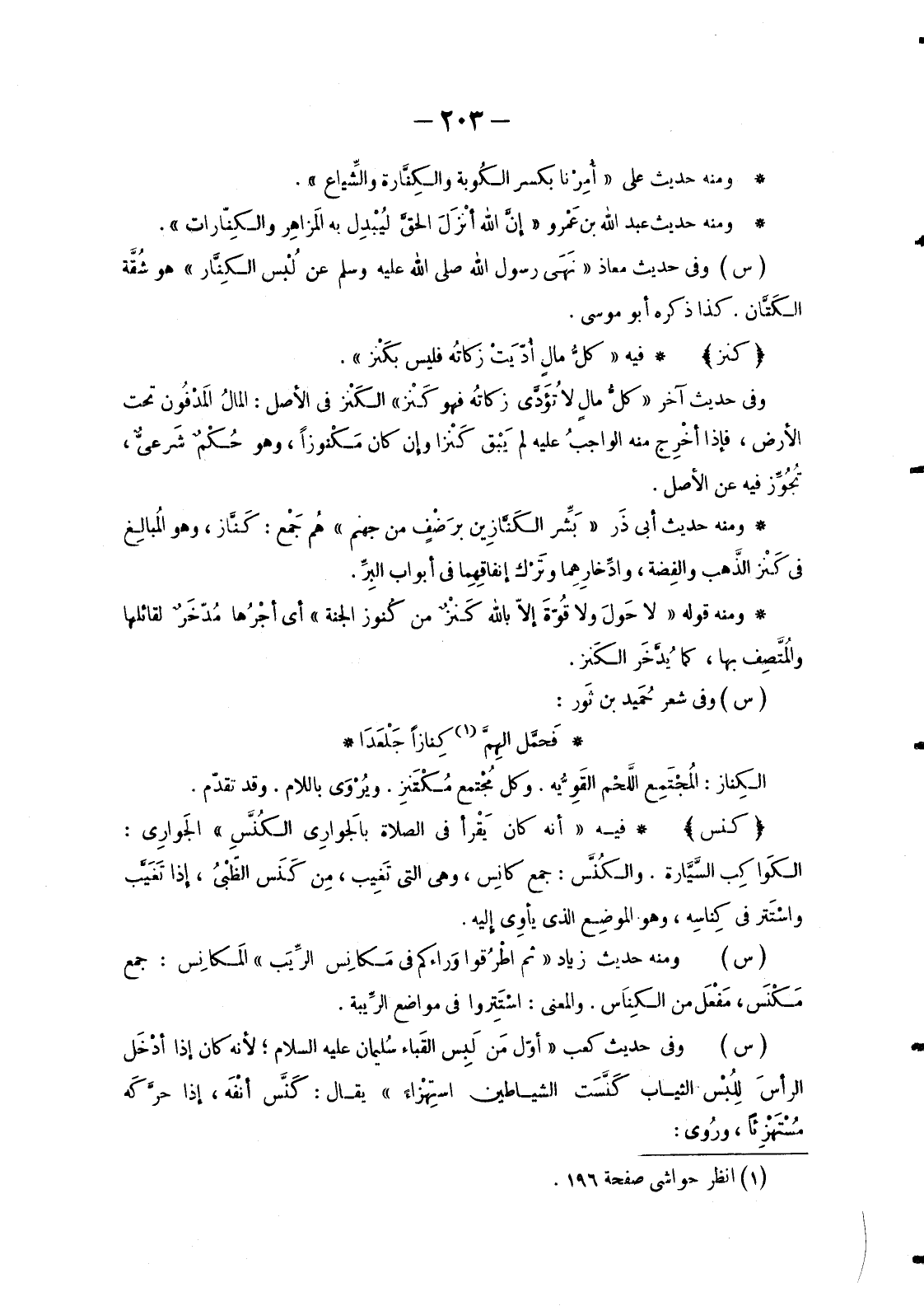 وَفِي حَدِيثٍ آخَرَ «كلُّ مالٍ لَا تُؤَدَّى زكاتُه فَهُوَ كَنْز» الكَنْز فِي الْأَصْلِ: المالُ المَدْفُون تَحْتَ الْأَرْضِ، فَإِذَا أخْرِج مِنْهُ الواجبُ عَلَيْهِ لَمْ يَبْق كَنْزا وَإِنْ كَانَ مَكْنُوزاً، وَهُوَ حُكْمٌ شَرعيٌّ، تُجُوِّز فِيهِ عَنِ الْأَصْلِ.