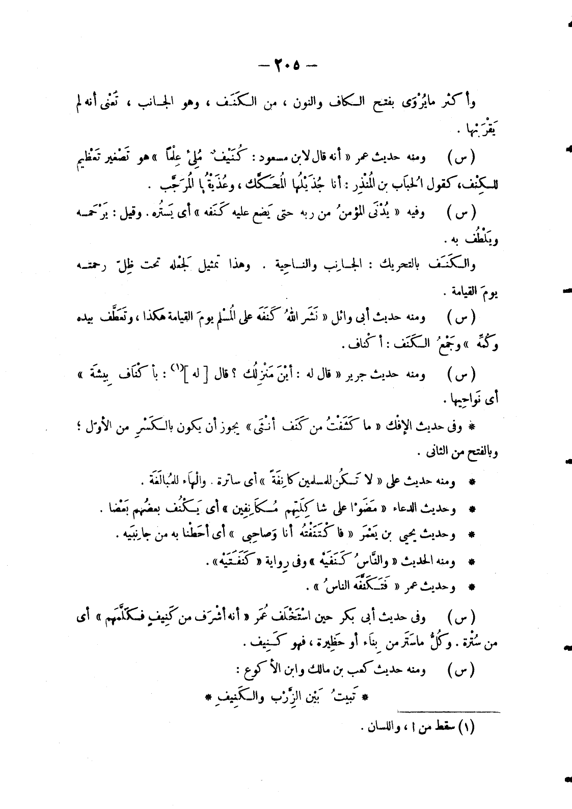 وَمِنْهُ حَدِيثُ عَلِيٍّ «لَا تَكُن لِلْمُسْلِمِينَ كَانِفَةً» أَيْ سَاتِرَةً. والْهَاء للمُبالَغَة.