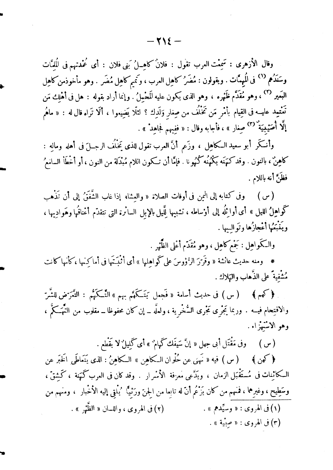 كاهِنٌ، بِالنُّونِ. وَقَدْ كهَنَه يكْهُنُه كُهُوناً. فأمَّا أَنْ تَكُونَ اللَّامُ مُبْدَلة مِنَ النُّونِ، أَوْ أخْطَأ السامعُ فظَنَّ أَنَّهُ بِاللَّامِ.