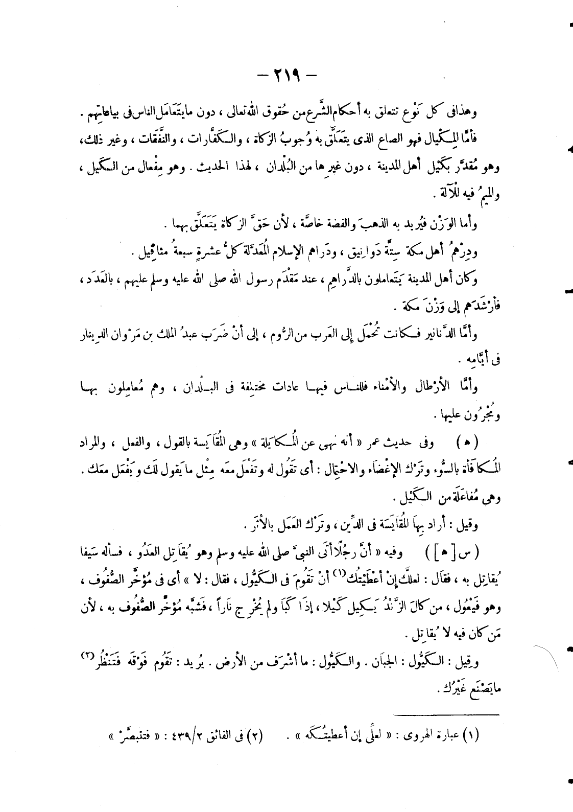 فأمَّا المِكْيال فَهُوَ الصَّاعُ الَّذِي يتَعَلَّق بِهِ وُجوب الزَّكَاةِ، والكَفَّارات، والنَّفَقات، وَغَيْرِ ذَلِكَ، وَهُوَ مُقدَّر بكَيْل أَهْلِ الْمَدِينَةِ، دُونَ غيرِها مِنَ البُلْدان، لِهَذَا الْحَدِيثِ. وَهُوَ مِفْعال مِنَ الكَيل، والميمُ فِيهِ للآْلة.