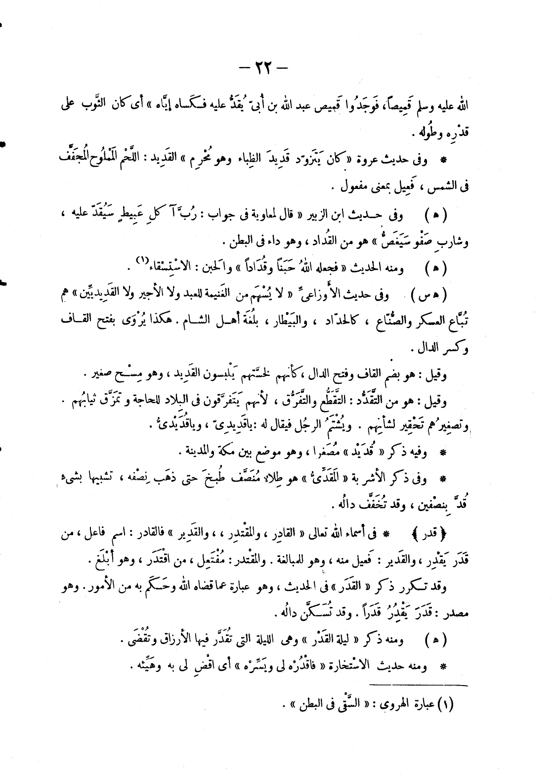وَقَدْ تَكَرَّرَ ذِكْرُ «القَدَر» فِي الْحَدِيثِ، وَهُوَ عِبَارَةٌ عَمَّا قَضَاهُ اللَّهُ وحَكَم بِهِ مِنَ الْأُمُورِ. وَهُوَ مَصْدَرُ: قَدَرَ يَقْدِر قَدَراً. وَقَدْ تُسَكَّن دالُه.