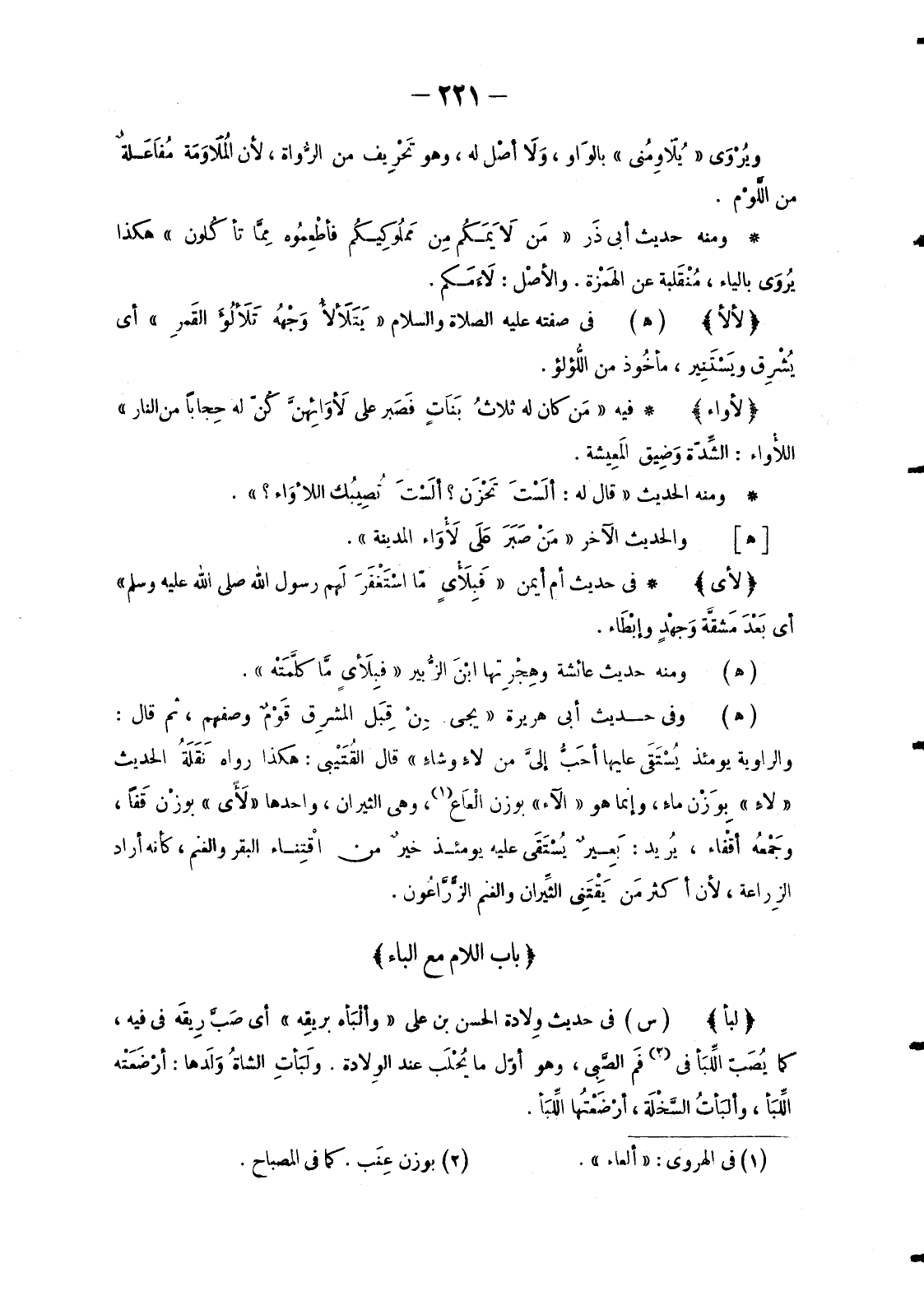 - فِيهِ «مَن كَانَ لَهُ ثَلَاثُ بَنَات فَصَبر عَلَى لَأْوَائِهِنَّ كَنّ لَهُ حِجاباً مِنَ النَّارِ» اللأْواء: الشِّدة وَضِيق المَعِيشة.