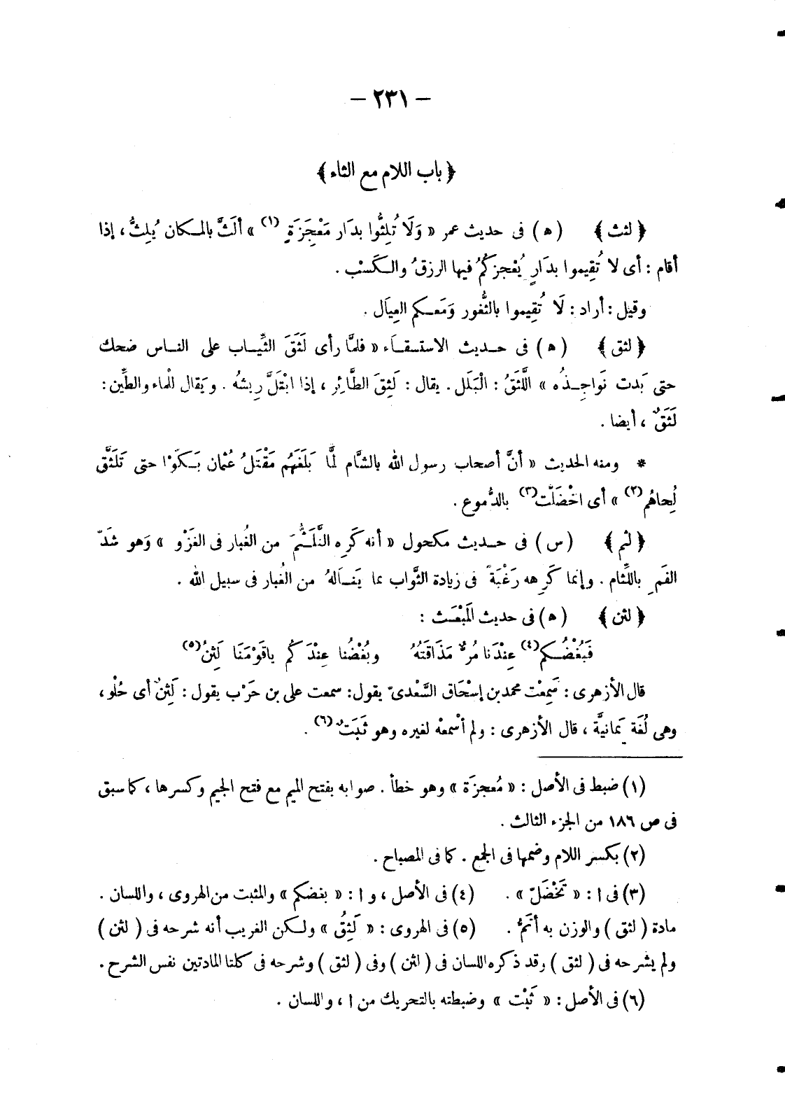 (5) في الهروي: «لَثِقُ» ولكن الغريب أنه شرحه في (لثن) ولم يشرحه في (لثق) وقد ذكره اللسان في (لثن) وفي (لثق) وشرحه في كلتا المادتين نفس الشرح.