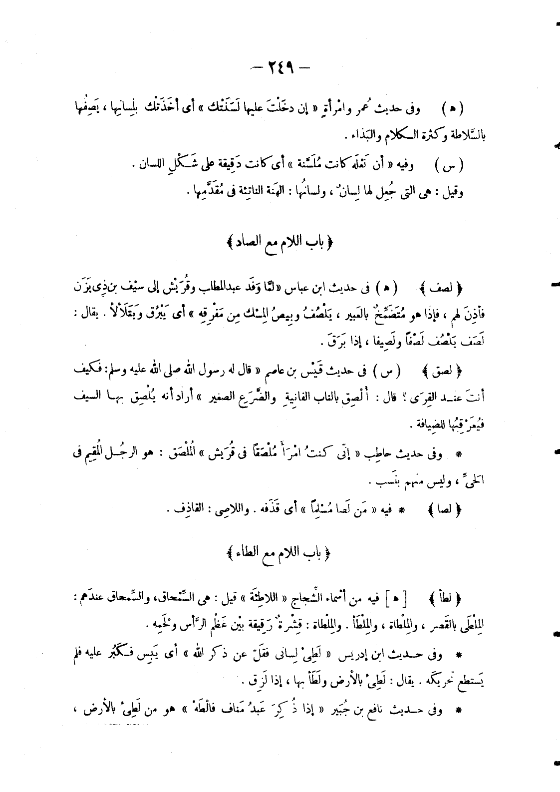 - فِيهِ «مَن لَصَا مُسْلِماً» أَيْ قَذَفه. واللاصِي: القاذِف.