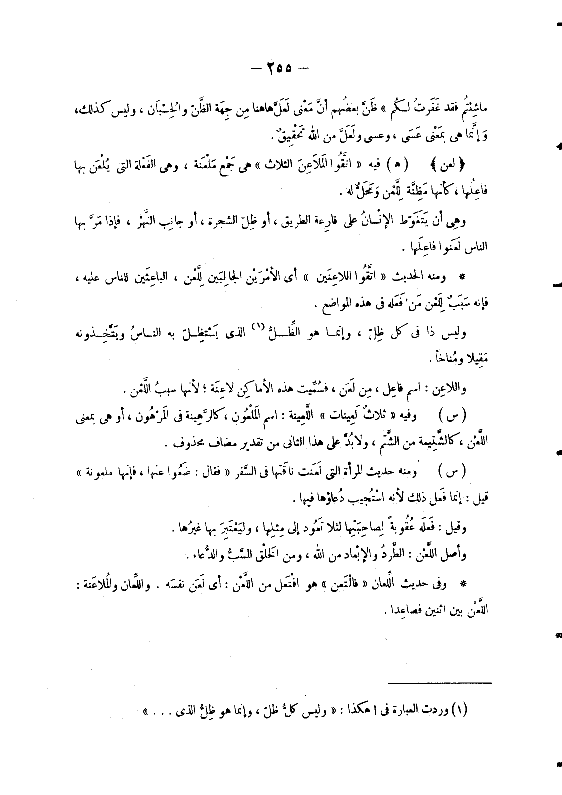 وَمِنْهُ الْحَدِيثُ «اتَّقُوا اللاعِنَيْن» أَيِ الأمْرَيْن الجالِبَين لِلَّعْن، الباعِثَين لِلنَّاسِ عَلَيْهِ، فَإِنَّهُ سَبَبٌ لِلَعْن مَن فَعَله فِي هَذِهِ الْمَوَاضِعِ.