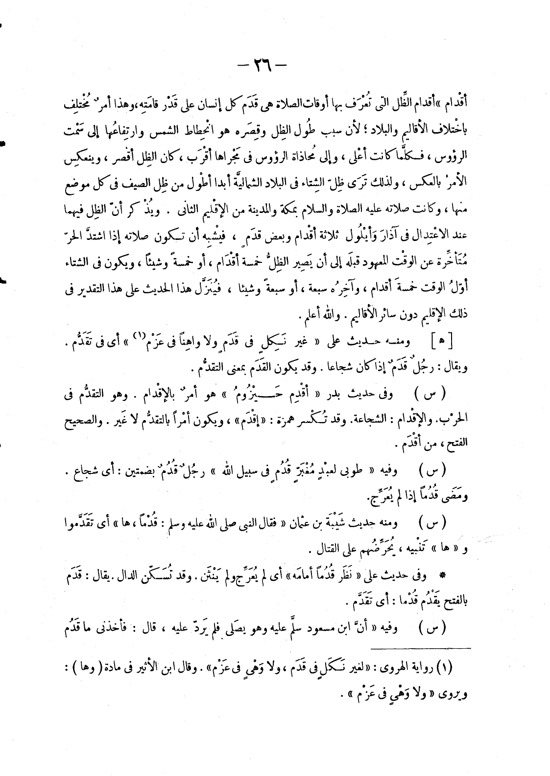 أَقْدام» أَقْدام الظَّل الَّتِي تُعْرَف بِهَا أَوْقَاتُ الصَّلَاةِ هِيَ قَدَم كُلِّ إِنْسَانٍ عَلَى قَدْر قامَتِه، وَهَذَا أمرٌ مُخْتلِف باخْتلاف الْأَقَالِيمِ وَالْبِلَادِ؛ لِأَنَّ سَبَبَ طُول الظِل وقِصَره هُوَ انحِطاط الشمس وارتِفاعُها إلى سَمْت الرؤوس، فكلَّما كانت أعْلى، وإلى مُحاذاة الرؤوس فِي مَجْراها أقْرَب، كَانَ الظِل أقْصر، وينعكِس الأمرْ بِالْعَكْسِ، وَلِذَلِكَ تَرَى ظِلّ الشِتاء فِي الْبِلَادِ الشماليَّة أَبَدًا أطْول مِنْ ظِل الصَّيْفِ فِي كُلِّ مَوْضِعٍ مِنْهَا، وَكَانَتْ صَلَاتُهُ عَلَيْهِ الصَّلَاةُ وَالسَّلَامُ بِمَكَّةَ وَالْمَدِينَةِ مِنَ الْإِقْلِيمِ الثَّانِي. ويُذْكر أَنَّ الظِل فِيهِمَا عِنْدَ الاعْتِدال فِي آذارَ وأيْلُول ثَلَاثَةُ أَقْدام وَبَعْضُ قَدَم، فيشْبِه أَنْ تَكُونَ صَلَاتُهُ إِذَا اشتدَّ الْحَرُّ مُتَأخِّرة عَنِ الوقْت الْمَعْهُودِ قبلَه إِلَى أَنْ يَصِير الظِلُّ خَمْسَةَ أَقْدَام، أَوْ خَمْسَةً وَشَيْئًا، وَيَكُونُ فِي الشِّتَاءِ أوّلَ الْوَقْتِ خمسةَ أَقْدام، وآخِرُه سَبْعَةً، أَوْ سَبْعَةً وَشَيْئًا، فيُنَزَّل هَذَا الْحَدِيثُ عَلَى هَذَا التَّقْدِيرِ فِي ذَلِكَ الْإِقْلِيمِ دُونَ سَائِرِ الْأَقَالِيمِ. وَاللَّهُ أَعْلَمُ.