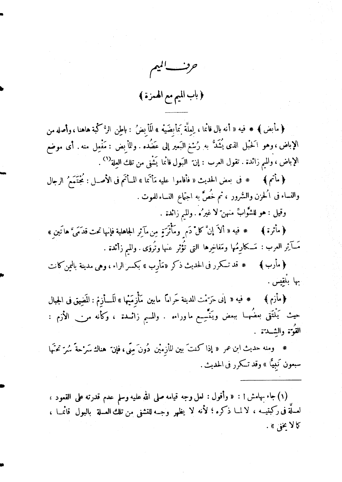- فِيهِ «إِنِّي حَرّمْت الْمَدِينَةَ حَراماً مَا بَيْنَ مَأْزِمَيْها» المَأزِم: المَضِيق فِي الْجِبَالِ حَيْثُ يَلْتَقي بعضُها بِبَعْضٍ ويَتَّسِع مَا وَرَاءَهُ. وَالْمِيمُ زَائِدَةٌ، وَكَأَنَّهُ مِنَ الْأَزْمِ:
