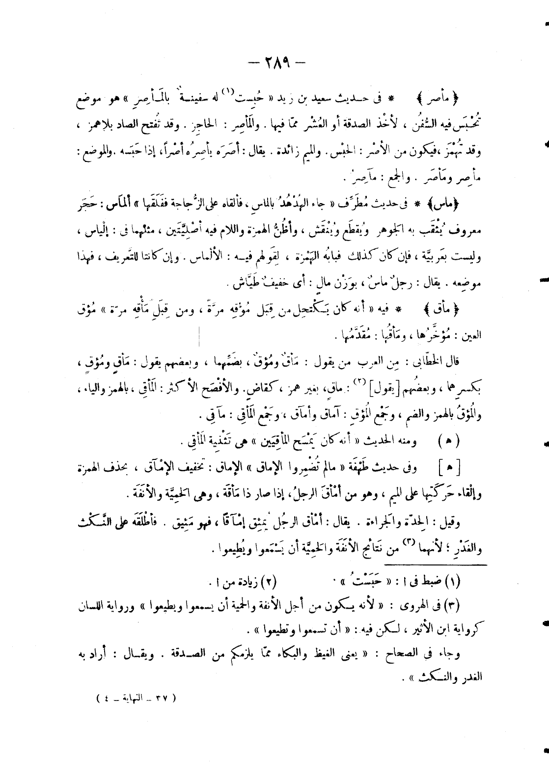 (3) في الهروي: «لأنه يكون من أجل الأنفة والحمية أن يسمعوا ويطيعوا» ورواية اللسان كرواية ابن الأثير، لكن فيه: «أن تسمعوا وتطيعوا» . وجاء في الصحاح: «يعني الغيظ والبكاء ممّا يلزمكم من الصدقة. ويقال: أراد به الغدر والنكث» .