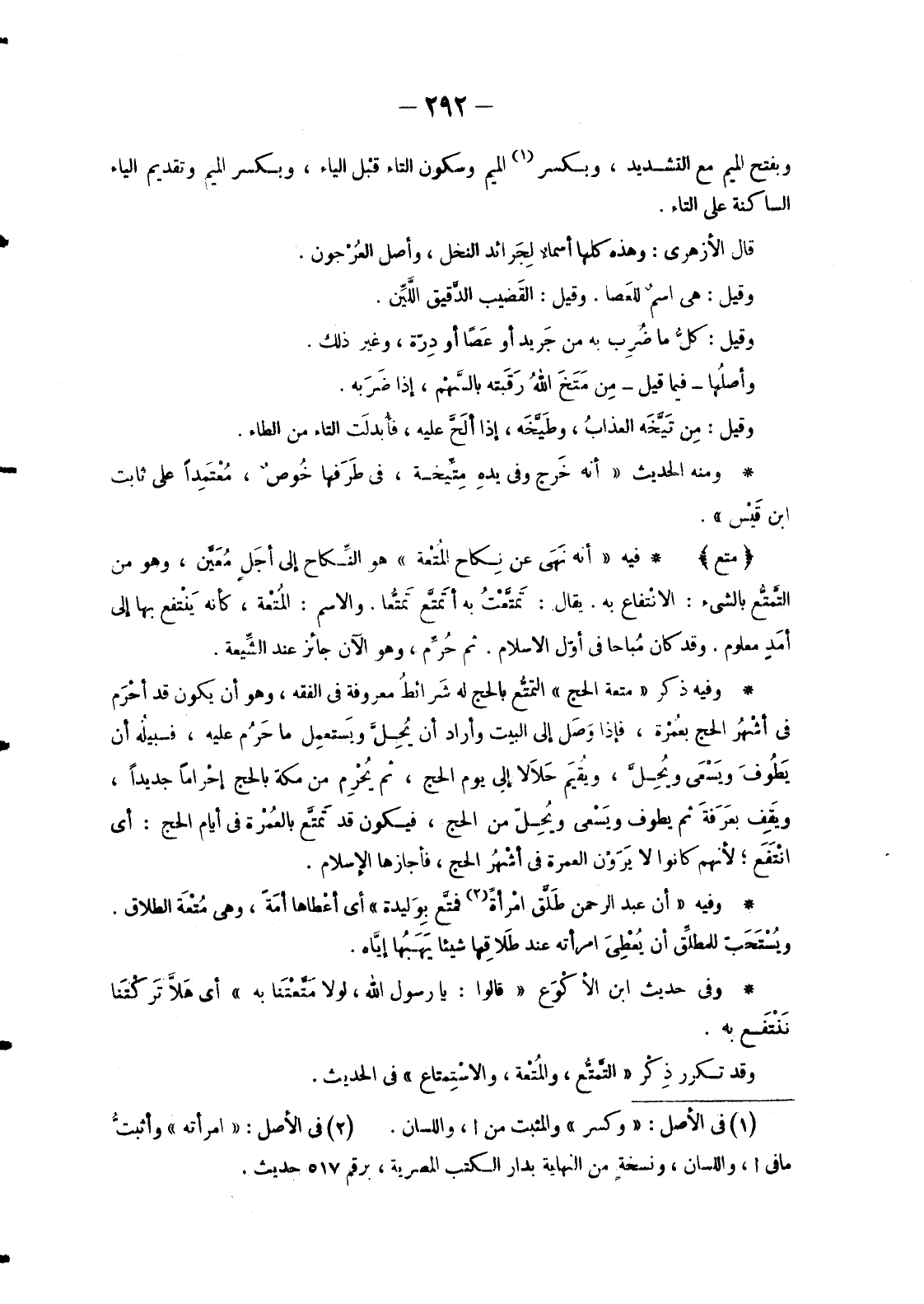 وَفِيهِ ذِكْرُ «مُتْعَة الْحَجِّ» التَمَتُّع بِالْحَجِّ لَهُ شَرائطُ مَعْرُوفَةٌ فِي الْفِقْهِ، وَهُوَ أَنْ يَكُونَ قَدْ أحْرَم فِي أشْهُر الْحَجِّ بعُمرة، فَإِذَا وَصَل إِلَى الْبَيْتِ وَأَرَادَ أَنْ يُحِلَّ ويَستعمِل مَا حَرُم عَلَيْهِ، فسبيلُه أَنْ يَطُوفَ ويَسْعَى ويُحِلَّ، ويُقيمَ حَلالاً إِلَى يَوْمِ الْحَجِّ، ثُمَّ يُحْرِم مِنْ مَكَّةَ بِالْحَجِّ إحْراماً جَدِيدًا، ويَقِف بعَرَفةَ ثُمَّ يَطُوفُ ويَسْعى ويُحِلّ مِنَ الْحَجِّ، فَيَكُونُ قَدْ تَمَتَّعَ بالعُمْرة فِي أَيَّامِ الْحَجِّ: أَيِ انْتَفَع؛ لِأَنَّهُمْ كَانُوا لَا يَرَوْن الْعُمْرَةَ فِي أشْهُر الْحَجِّ، فَأَجَازَهَا الْإِسْلَامُ.