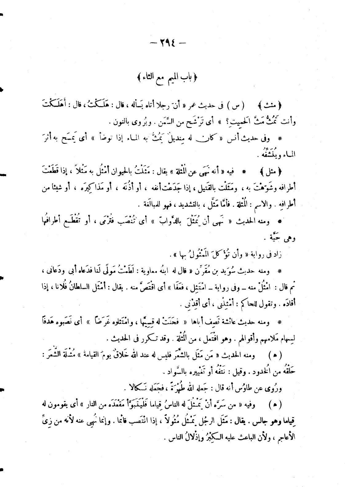 - فِيهِ «أَنَّهُ نَهَى عَنْ المُثْلَة» يُقَالُ: مَثَلْتُ بِالْحَيَوَانِ أَمْثُلُ بِهِ مَثْلًا، إِذَا قَطَعْتَ أَطْرَافَهُ وشَوّهْتَ بِهِ، ومَثَلْتُ بالقَتيل، إِذَا جَدَعْت أَنْفَهُ، أَوْ أذُنَه، أَوْ مَذاكِيرَه، أَوْ شَيْئًا مِنْ أطرافِه. وَالِاسْمُ: المُثْلَة. فأمَّا مَثَّلَ، بِالتَّشْدِيدِ، فَهُوَ للمبالَغة.