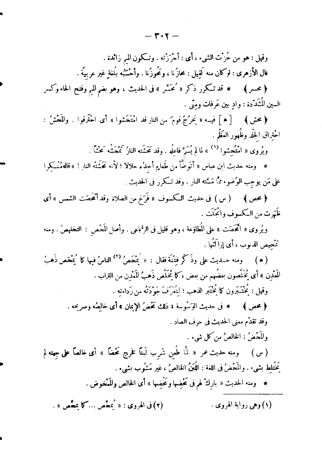 وَمِنْهُ حَدِيثُ ابْنِ عَبَّاسٍ «أتَوضَّأ مِنْ طَعامٍ أجِدُه حَلَالًا؛ لِأَنَّهُ مَحَشَتْهُ النَّارُ!» قَالَهُ مُنْكِراً عَلَى مَن يوجِب الوُضوء ممَّا مَسَّته النَّارُ. وَقَدْ تَكَرَّرَ فِي الْحَدِيثِ.
