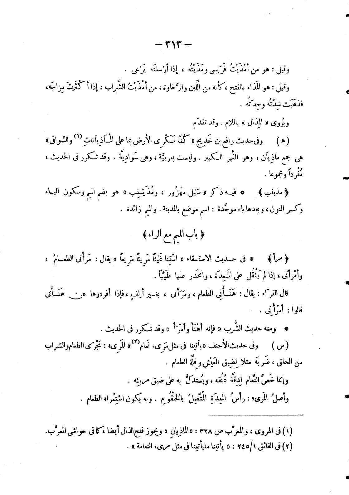 - فِيهِ ذِكْرُ «سَيْل مهْزُور، ومُذَيْنِب» هُوَ بِضَمِّ الْمِيمِ وَسُكُونِ الْيَاءِ وَكَسْرِ النُّونِ، وَبَعْدَهَا بَاءٌ موحَّدة: اسْمُ مَوْضِعٍ بِالْمَدِينَةِ. وَالْمِيمُ زَائِدَةٌ.