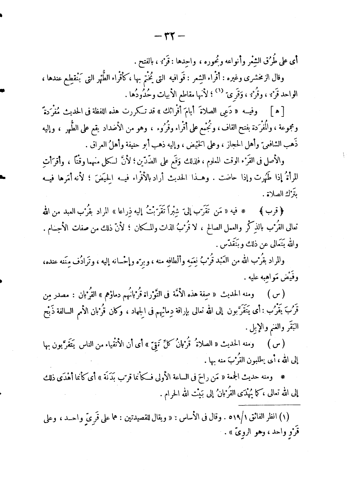- فِيهِ «مَن تَقَرَّب إِلَيَّ شِبْراً تَقَرَّبْتُ إِلَيْهِ ذِراعاً» الْمُرَادُ بقُرْب الْعَبْدِ مِنَ اللَّهِ تَعَالَى القُرْب بالذِكْر وَالْعَمَلِ الصَّالِحِ، لَا قُرْبُ الذَّاتِ وَالْمَكَانِ؛ لِأَنَّ ذَلِكَ مِنْ صِفَاتِ الْأَجْسَامِ.