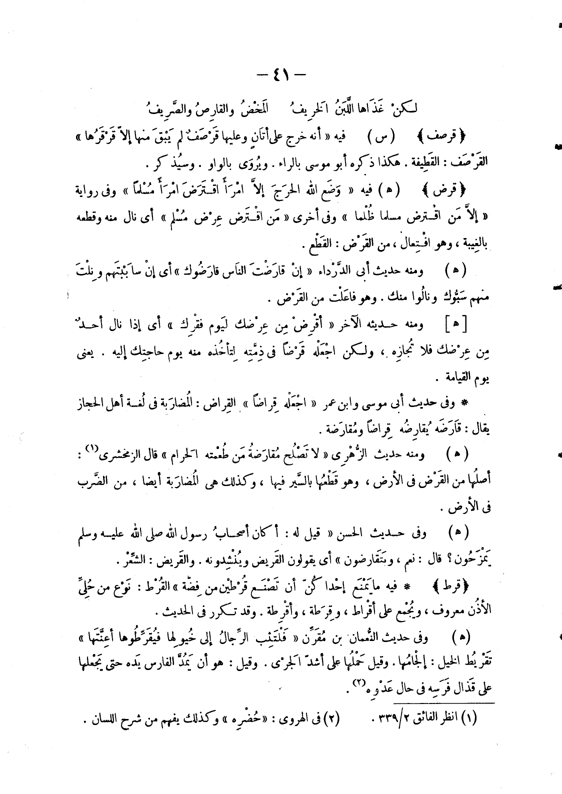 وَفِي حَدِيثِ أَبِي مُوسَى وَابْنِ عُمَرَ «اجْعَلْه قِراضاً» القِراض: المُضارَبة فِي لُغة أَهْلِ الْحِجَازِ يُقَالُ: قَارَضَه يُقَارِضُه قِراضاً ومُقَارَضَة.