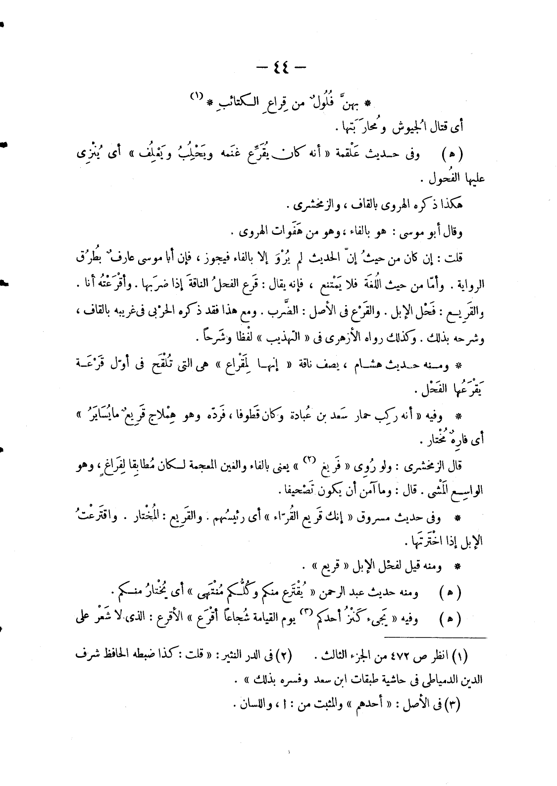 قُلْتُ: إِنْ كَانَ مِنْ حيثُ إِنَّ الْحَدِيثَ لَمْ يُرْوَ إِلَّا بِالْفَاءِ فَيَجُوزُ، فَإِنَّ أَبَا مُوسَى عارفٌ بطُرُق الرِّوَايَةِ. وَأَمَّا مِنْ حَيْثُ الُلغَة فَلَا يَمْتنع، فَإِنَّهُ يُقَالُ: قَرَع الفحلُ الناقةَ إِذَا ضرَبها. وأَقْرَعْتُه أَنَا.
