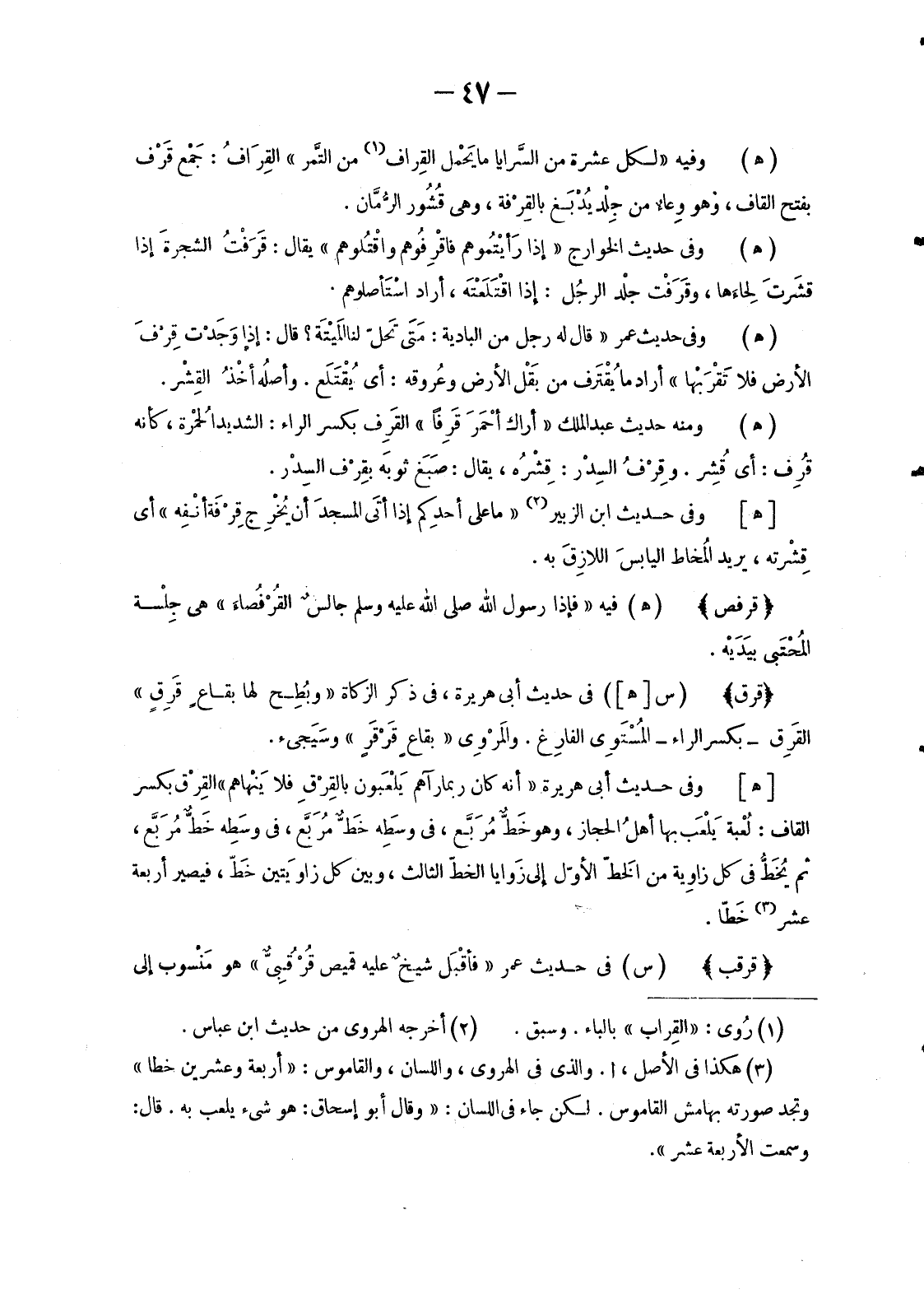 [هـ] وَفِي حَدِيثِ أَبِي هُرَيْرَةَ «أَنَّهُ كَانَ رُبَّمَا رَآهُمْ يَلْعَبون بالقِرْقِ فَلَا يَنْهاهم» القِرْق بِكَسْرِ الْقَافِ: لُعْبة يَلْعَب بِهَا أهلُ الْحِجَازِ، وَهُوَ خَطٌّ مُرَبَّع، فِي وسَطِه خَطٌّ مُرَبَّع، فِي وسَطِه خَطٌّ مُرَبَّع، ثُمَّ يُخَطُّ فِي كُلِّ زاوِية مِنَ الخَطّ الْأَوَّلِ إِلَى زَوَايَا الْخَطِّ الثَّالِثِ، وَبَيْنَ كُلِّ زاويَتين خَطّ، فَيَصِيرُ أَرْبَعَةَ عَشَرَ «3» خَطّاً.