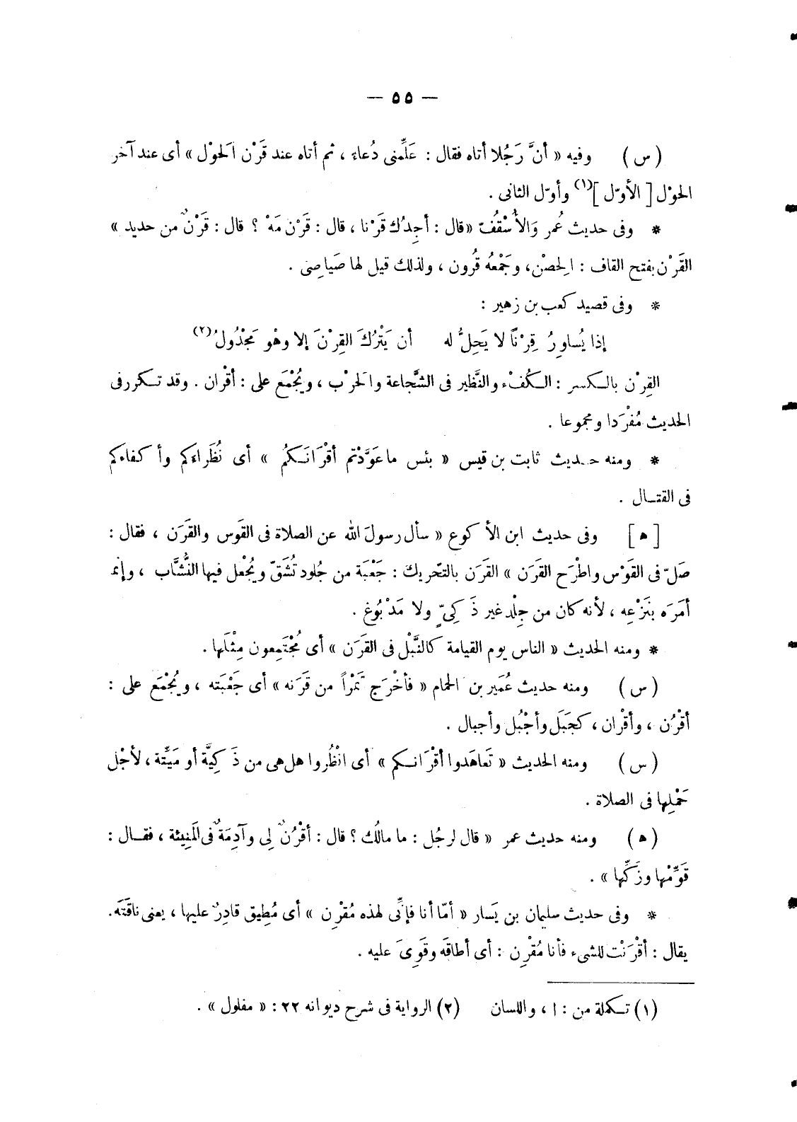 القِرْن بِالْكَسْرِ: الكُفْء والنَّظير فِي الشَّجاعة والحَرْب، ويُجْمَع عَلَى: أَقْران. وَقَدْ تَكَرَّرَ فِي الْحَدِيثِ مُفْرداً وَمَجْمُوعًا.
