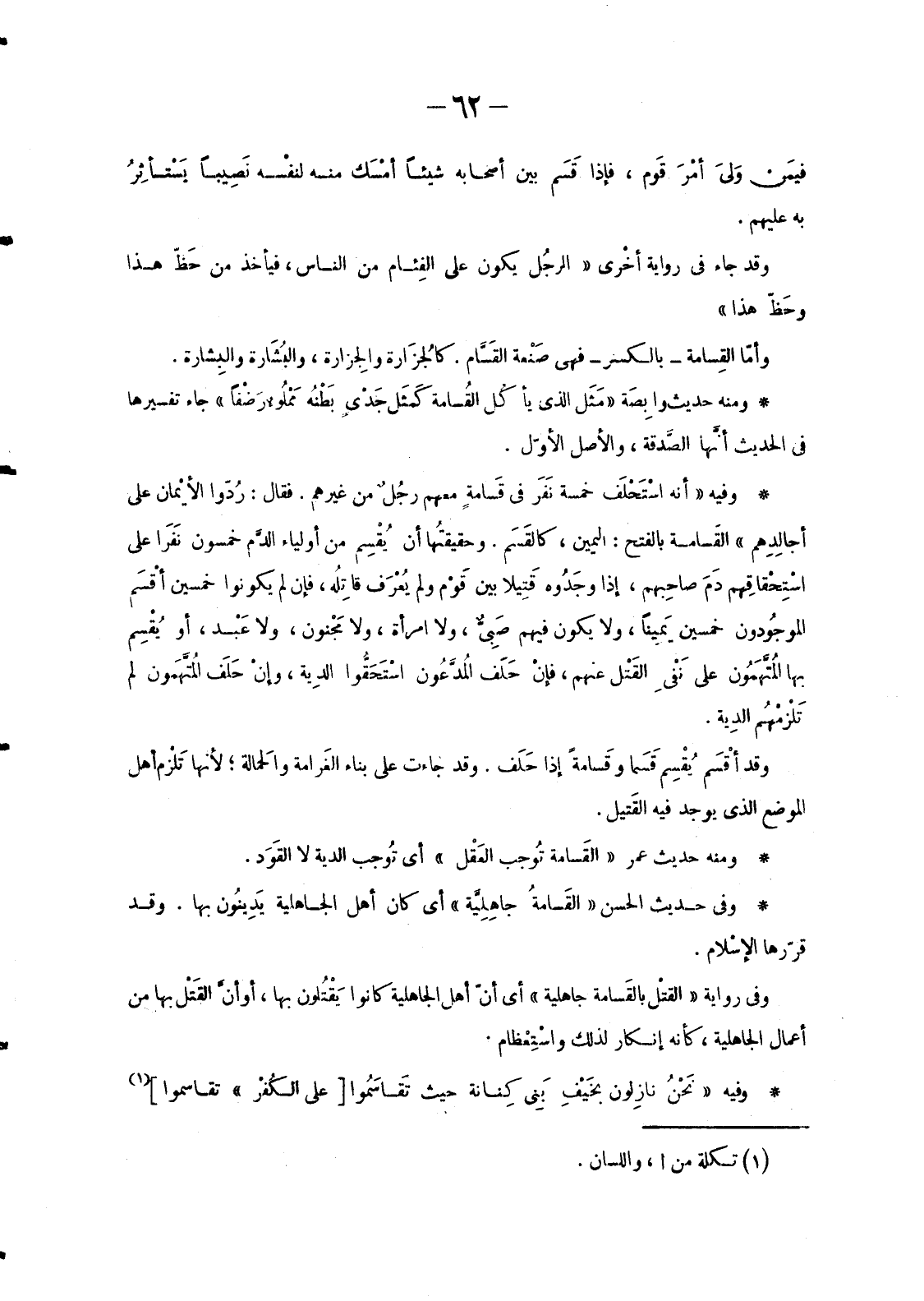 وَفِي رِوَايَةٍ «القتْل بالقَسامة جَاهِلِيَّةٌ» أَيْ أَنَّ أَهْلَ الْجَاهِلِيَّةِ كَانُوا يَقْتُلون بِهَا، أَوْ أنَّ القَتْل بِهَا مِنْ أَعْمَالِ الْجَاهِلِيَّةِ، كَأَنَّهُ إِنْكَارٌ لِذَلِكَ واسْتِعْظام.