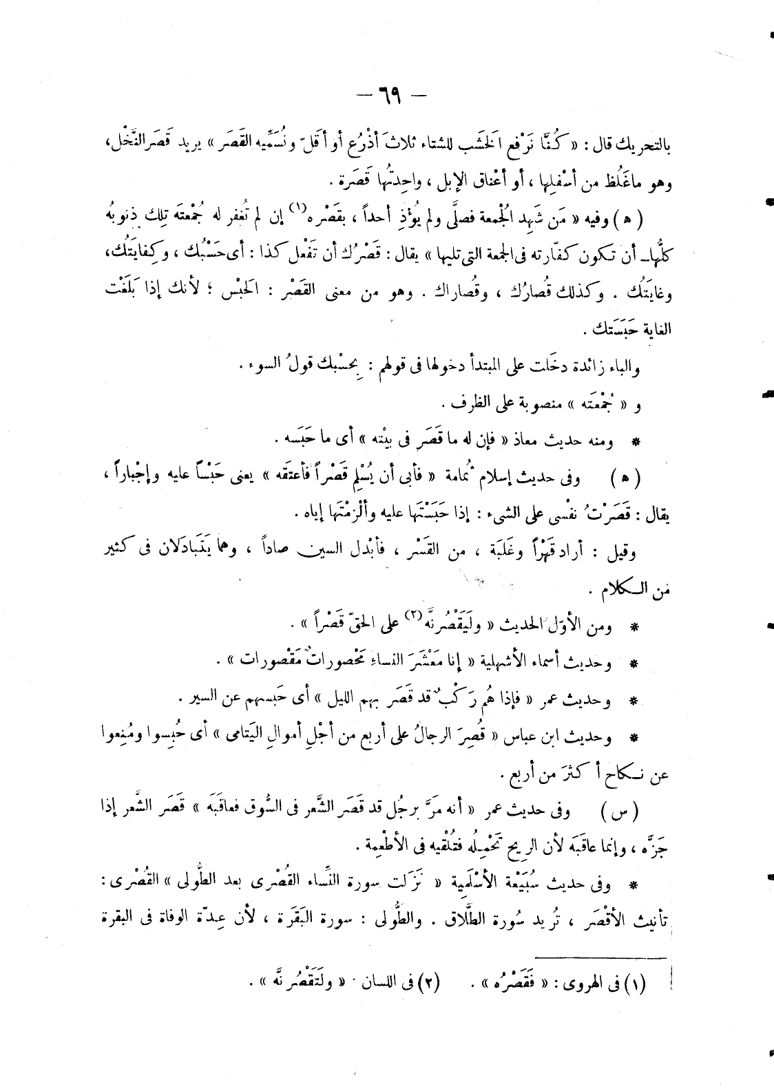 وَمِنَ الْأَوَّلِ الْحَدِيثُ «ولَيَقْصُرنَّه «2» عَلَى الْحَقِّ قَصْراً» .