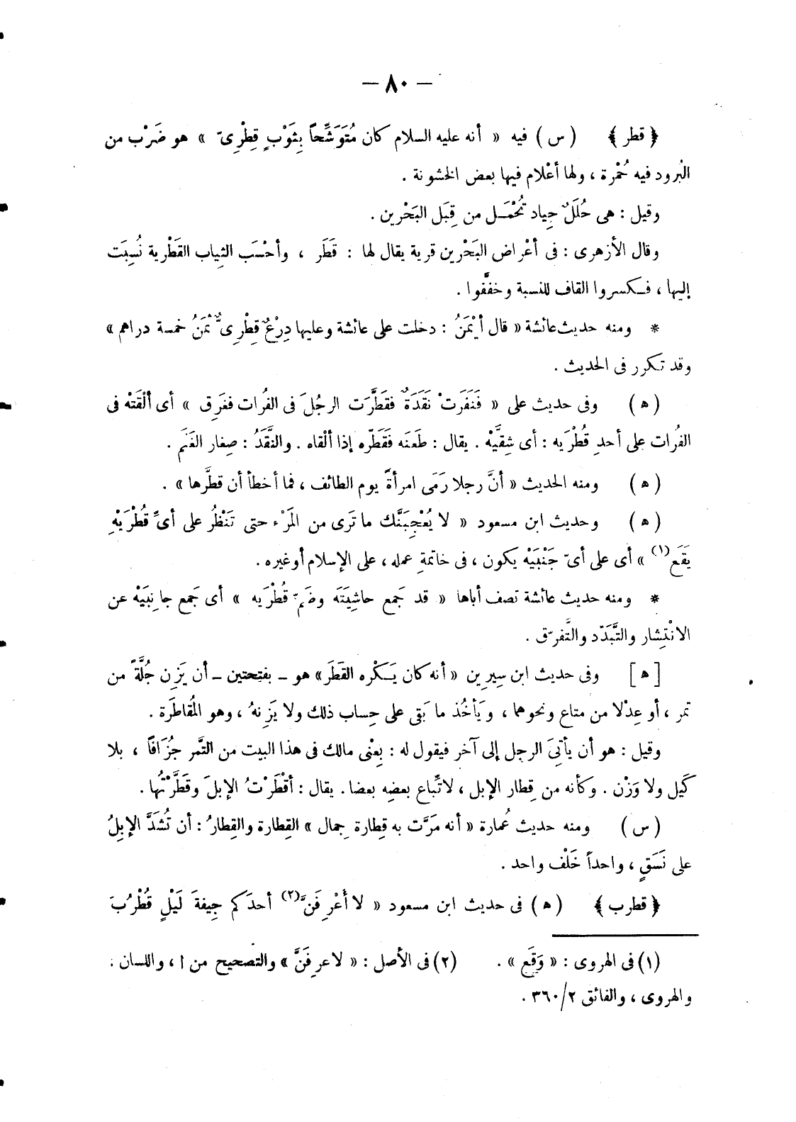 وَمِنْهُ حَدِيثُ عَائِشَةَ «قَالَ أيْمَنُ: دَخَلْتُ عَلَى عَائِشَةَ وَعَلَيْهَا دَرْعٌ قِطْرِيٌّ ثَمنُ خَمْسَةِ دَرَاهِمَ» وَقَدْ تَكَرَّرَ فِي الْحَدِيثِ.