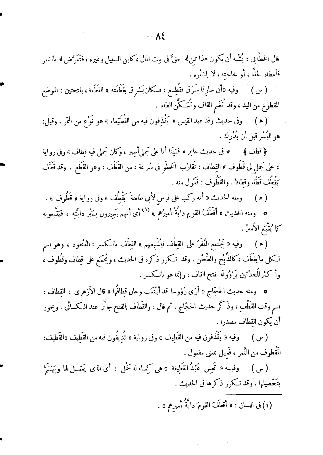 - فِي حَدِيثِ جَابِرٍ «فبَينْا أَنَا عَلَى جَمَلِي أَسِيرُ، وَكَانَ جَملي فِيهِ قِطاف» وَفِي رِوَايَةٍ «عَلَى جَملٍ لِي قَطُوف» القِطاف: تَقَارُب الخَطْوِ فِي سُرعة، مِنَ القَطْف: وَهُوَ القَطْع. وَقَدْ قَطَفَ يَقْطِف قَطْفا وقِطافا. والقَطُوف: فَعُول مِنْهُ.