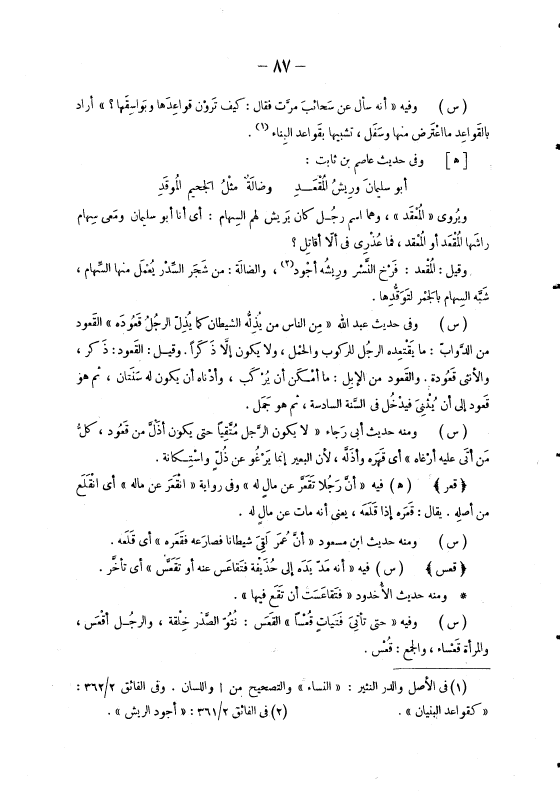 (1) في الأصل والدر النثير: «النساء» والتصحيح من اواللسان. وفي الفائق 2/ 362: «كقواعد البنيان» .