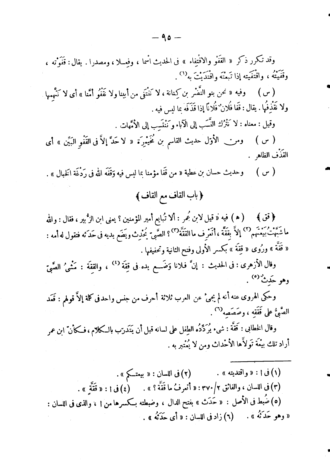وَقَدْ تَكَرَّرَ ذِكْرُ «القَفْو والاقْتِفاء» فِي الْحَدِيثِ اْسماً، وَفِعْلًا، وَمَصْدَرًا. يُقَالُ: قَفَوْته، وقَفَيْتُه، واقْتَفَيته إِذَا تَبعْتَه واقْتَدَيْتَ بِهِ» .