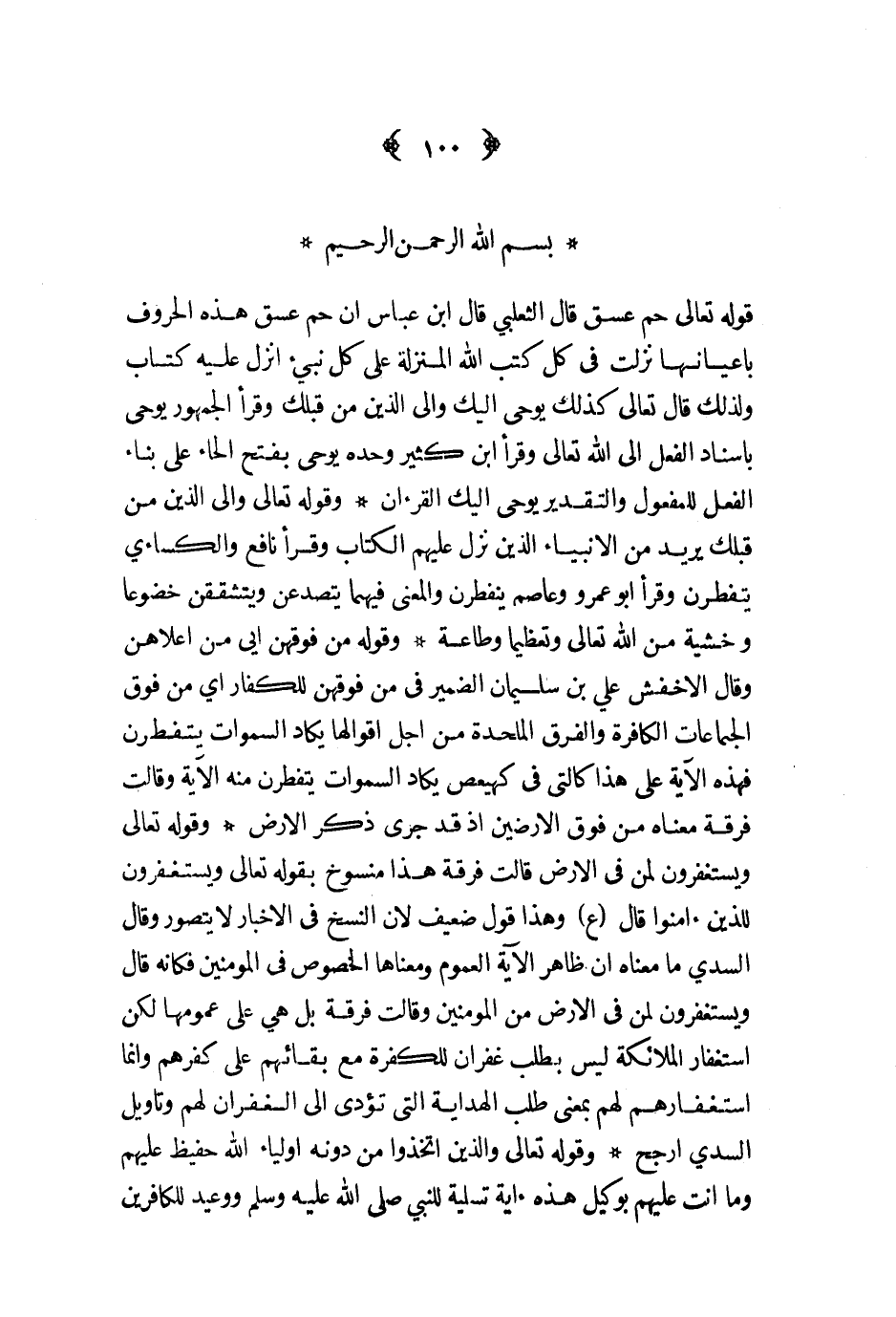 بسم الله الرحمن الرحيم قوله تعالى حم عسق قال الثعلبي قال ابن عباس أن حم عسق هذه الحروف بأعيانها نزلت في كل كتب الله المنزلة على كل نبي أنزل عليه كتاب ولذلك قال تعالى كذلك يوحي اليك والى الذين من قبلك وقرأ الجمهور يوحي باسناد الفعل الى الله تعالى وقرأ ابن كثير وحده يوحي بفتح الحاء على بناء الفعل للمفعول والتقدير يوحي اليك القرآن وقوله تعالى والى الذين من قبلك يريد من الأنبياء الذين نزل عليهم الكتاب وقرأ نافع والكسائي يتفطرن وقرأ أبو عمرة وعاصم ينفطرن والمعنى فيهما يتصدعن ويتشققن خضوعا وخشية من الله تعالى وتعظيما وطاعة وقوله من فوقهن أي من أعلاهن وقال الأخفش علي بن سليمان الضمير من فوقهن للكفار أي من فوق الجماعات الكافرة والفرق الملحدة من أجل أقوالها يكاد السماوات يتفطرن فهذه الآية على هذا كالتي في كهيعص يكاد السماوات يتفطرن منه الآية وقالت فرقة معناه من فوق الأرضين اذ قد جرى ذكر الأرض وقوله تعالى ويستغفرون لمن في الأرض قالت فرقة هذا منسوخ بقوله تعالى ويستغفرون للذين آمنوا قال ع وهذا قول ضعيف لأن النسخ في الاخبار لا يتصور وقال السدي ما معناه أن ظاهر الآية العموم ومعناها الخصوص في المؤمنين فكأنه قال ويستغفرون لمن في الأرض من المؤمنين وقالت فرقة بل هي على عمومها لكن استغفار الملائكة ليس بطلب غفران للكفرة مع بقائهم على كفرهم وانما استغفارهم لهم بمعنى طلب الهداية التي تؤدي الى الغفران لهم وتأويل السدي أرجح وقوله تعالى والذين اتخذوا من دونه أولياء الله حفيظ عليهم وما أنت عليهم بوكيل هذه آية تسلية للنبي صلى الله عليه و سلم ووعيد للكافرين