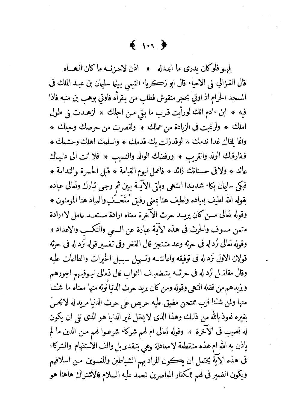 قال الغزالي في الأحياء قال أبو زكريا التيمي بينما سليمان بن عبد الملك في المسجد الحرام اذ أتوي بحجر منقوش فطلب من يقرأه فأوتي بوهب بن منبه فاذا فيه ابن آدم انك لو رأيت قرب ما بقي من أجلك لزهدت في طول أملك ولرغبت في الزيادة من عملك ولقصرت من حرصك وحيلك وانما يلقاك غدا ندمك لو قد زلت بك قدمك وأسلمك أهلك وحشمك ففارقك الولد والقريب ورفضك الوالد والنسيب فلا أنت الى دنياك عائد ولا في حسناتك زائد فاعمل ليوم القيامة قبل الحسرة والندامة فبكى سليمان بكاء شديدا انتهى وباقي الآية بين ثم رجى تبارك وتعالى عبادع بقوله الله لطيف بعباده ولطيف هنا بمعنى رفيق متحف والعباد هنا المؤمنون وقوله تعالى من كان يريد حرث الآخرة معناه ارادة مستعد عامل لا ارادة متمن مسوف والحرث في هذه الآية عبارة عن السعي والتكسب والاعداد وقوله تعالى نزد له في حرثه وعد متنجز قال الفخر وفي تفسير قوله نزد له في حرثه قولان الأول نزد له في توفيقه واعانته وتسهيل سبيل الخيرات والطاعات عليه وقال مقاتل نزد له في حرثه بتضعيف الثواب قال تعالى ليوفيهمم أجورهم ويزيدهم من فضله انتهى وقوله ومن كان يريد حرث الدنيا نؤته منها معناه ما شئنا منها ولمن شئنا فرب ممتحن مضيق عليه حريص على حرث الدنيا مريد له لا يحس بغيره نعوذ بالله من ذلك وهذا الذي لا يعقل غير الدنيا هو الذي نفى أن يكون له نصيب في الآخرة وقوله تعالى أم لهم شركاء شرعوا لهم من الدين ما لم يأذن به الله أم هذه منقطعة لا معادلة وهي بتقدير بل وألف الاستفهاك والشركاء في هذه الآية يحتمل أن يكون المراد بهم الشياطين والمغوين من أسلافهم ويكون الضمير في لهم للكفار المعاصرين لمحمد عليه السلام فالاشتراك هاهنا هو